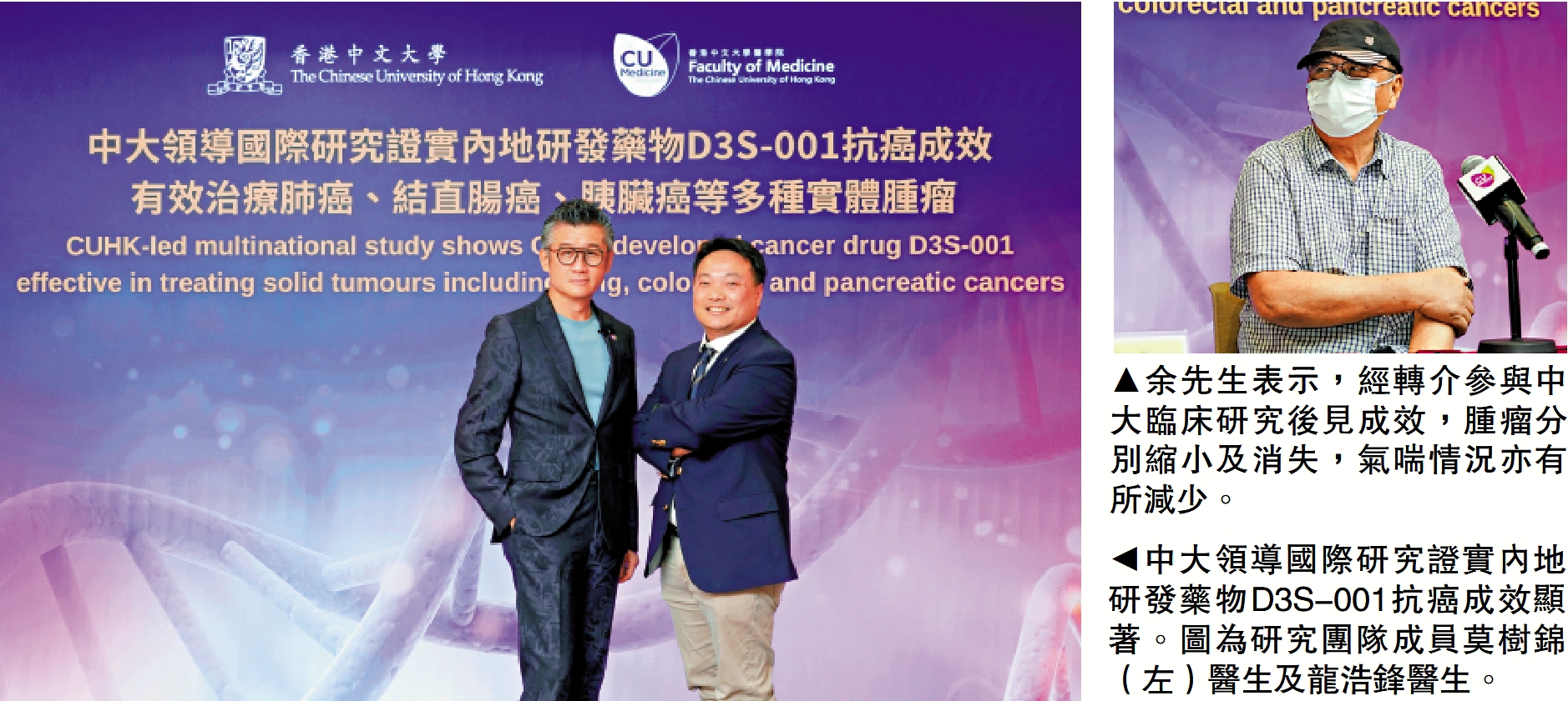 中大醫學院領導的跨國團隊進行了一項臨床研究,證實內地研發的新一代KRAS-G12C抑制劑D3S-001,能更有效治療肺癌、結直腸癌、胰臟癌等多種癌症,逾七成參與研究的晚期腫瘤病人服藥後,腫瘤有明顯縮小或完全消失;而且該藥物副作用輕微,每日只需服藥一次,患者長期使用方便且安全。有關研究結果已於頂尖醫學期刊《自然醫學》發表。\大公報記者 卓彤