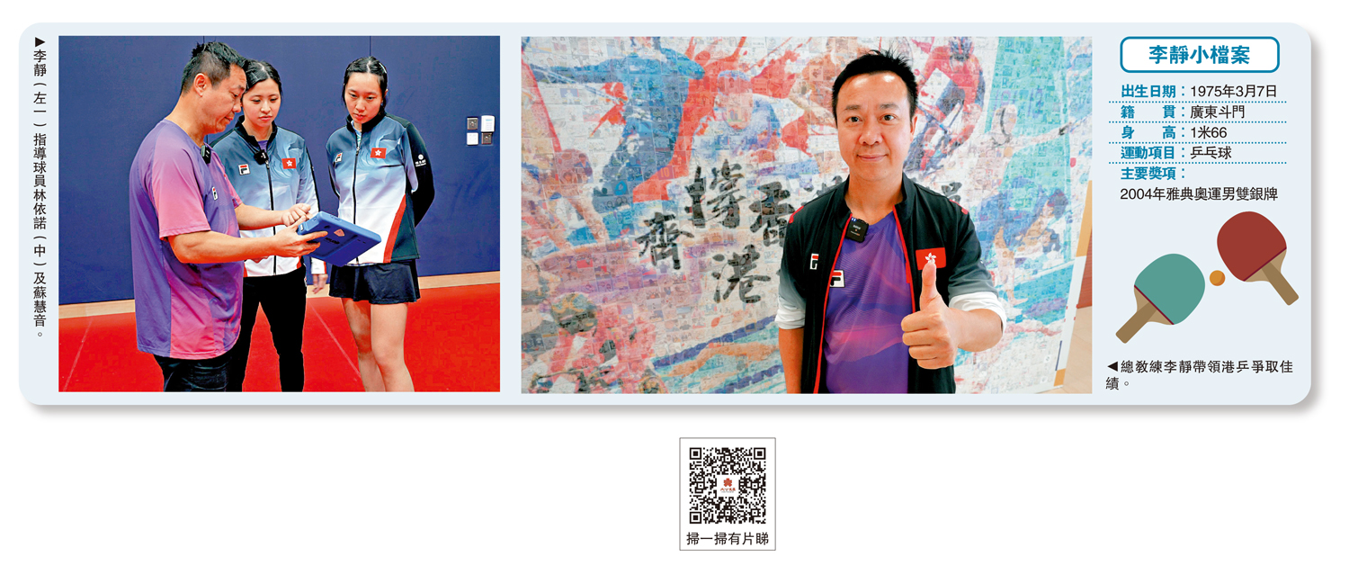 「基本上舊館的條件就是這樣,但在香港來說,有場地已經很好。」他回憶2000年從內地來港後,與中國香港乒乓總會共同打造香港乒乓球的品牌,慢慢培養本地球員,一輩接一輩地傳承下去。從以內地來港球員為主,到兩地融合,再到現在基本本地球員接班,李靜見證、參與了香港乒乓球運動的發展。