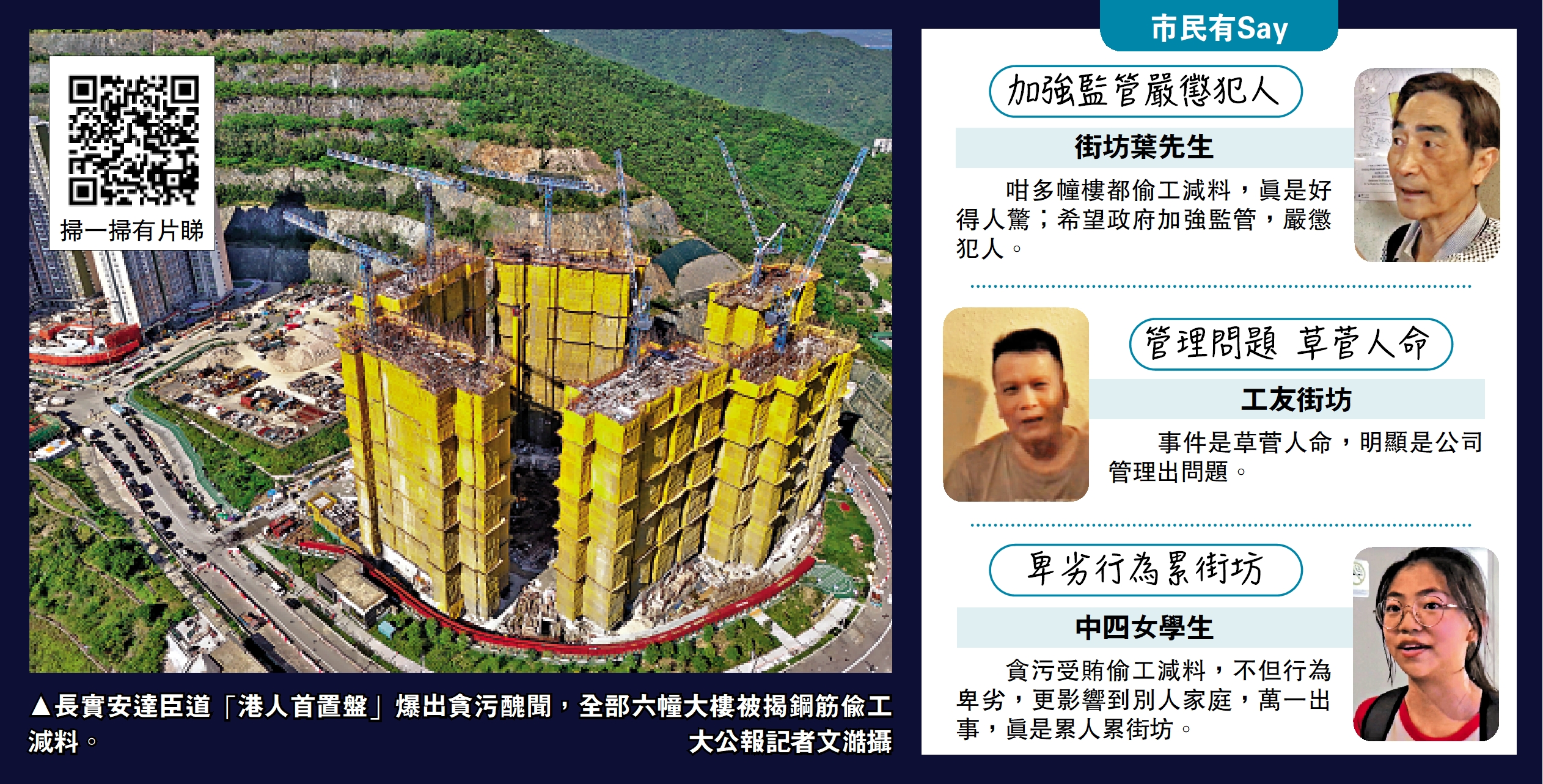 位於安達臣道的長實「港人首置盤」爆出分判商貪污醜聞,六幢住宅大廈鋼筋出現偷工減料,10人被廉署拘捕,事件激起公憤。大公報記者再到現場追訪,發現地盤未有復工跡象,附近街坊怒斥涉案者罔顧安全唯利是圖,草菅人命。