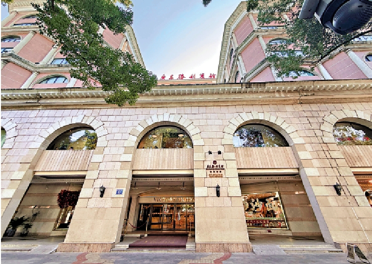 穿過沙面西橋,一幢西歐古典建築風格的酒店出現在眼前。宏偉的羅馬柱之間,「Victory Hotel」的淺金色招牌低調奢華,盡顯英式風情。這就是1888年開業的廣州第一間酒店─「沙面酒店」,1895年更名為「維多利亞酒店」,也就是今天的廣東勝利賓館。這家已經有130年歷史的酒店是廣州商貿發展歷史的見證者。一輛復古黃包車被安置在酒店門口,體現了厚重的歷史氣息。最近恰逢廣交會,大堂正中化身為「嶺南文化會客廳」。在這裏,賓客可以親手印製木版畫,將獨一無二的嶺南記憶帶回家。