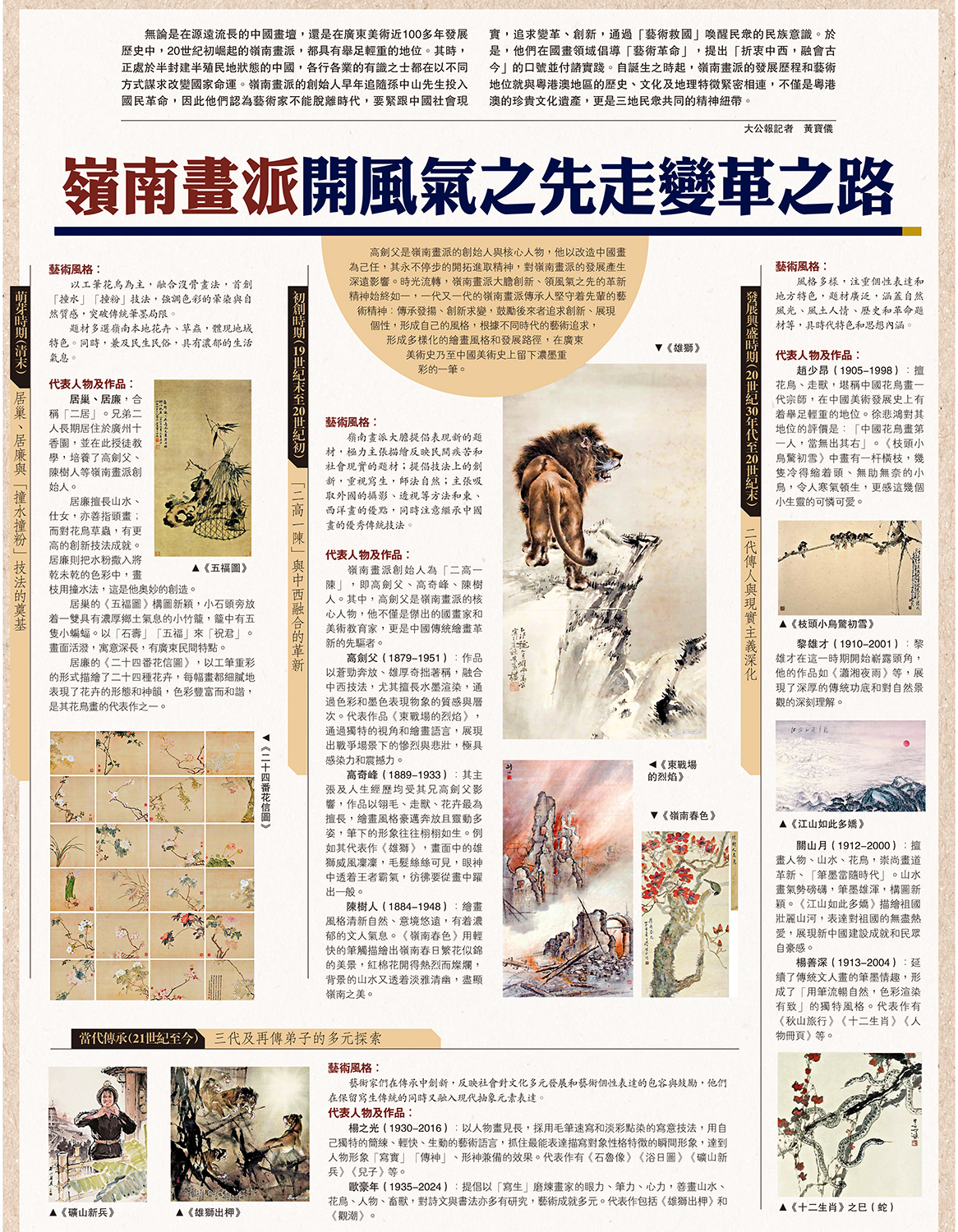 無論是在源遠流長的中國畫壇,還是在廣東美術近100多年發展歷史中,20世紀初崛起的嶺南畫派,都具有舉足輕重的地位。其時,正處於半封建半殖民地狀態的中國,各行各業的有識之士都在以不同方式謀求改變國家命運。嶺南畫派的創始人早年追隨孫中山先生投入國民革命,因此他們認為藝術家不能脫離時代,要緊跟中國社會現實,追求變革、創新,通過「藝術救國」喚醒民眾的民族意識。於是,他們在國畫領域倡導「藝術革命」,提出「折衷中西,融會古今」的口號並付諸實踐。自誕生之時起,嶺南畫派的發展歷程和藝術地位就與粵港澳地區的歷史、文化及地理特徵緊密相連,不僅是粵港澳的珍貴文化遺產,更是三地民眾共同的精神紐帶。\大公報記者 黃寶儀