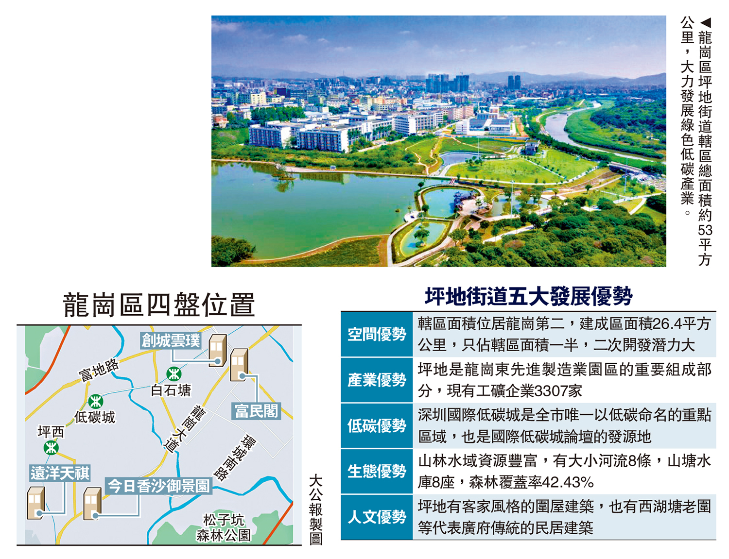 借勢深圳20大先進製造園區規劃,坪地與東莞清溪共建深莞先進製造合作示範區,打造「研發在坪地、生產在清溪」的產業鏈協作模式,預計2025年綠色科技產業規模將突破800億元(人民幣,下同)。另外,地鐵3號線延長線在坪地街道設有富坪站等站點,帶動當地樓市升溫,吸引剛需買家。\大公報記者 李昌鴻深圳報道