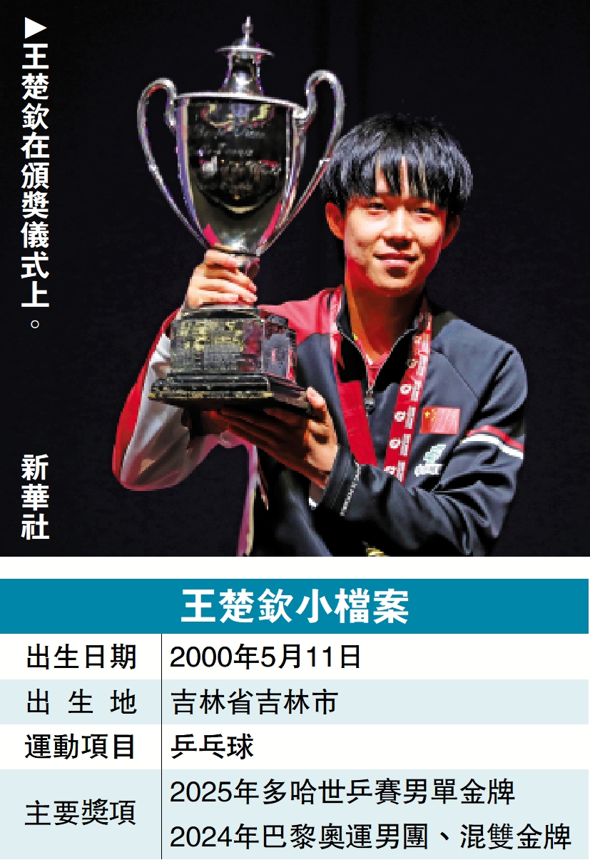 【大公報訊】記者譚德龍報道:國家隊昨晚在卡塔爾多哈舉行的世界乒乓球錦標賽取得男、女單冠軍。王楚欽於男單決賽以局數4:1輕取巴西球手雨果,個人首次奪得三大賽的男單錦標,亦是國家隊在此項目的11連冠;女單頭號種子孫穎莎於決賽以4:3險勝隊友王曼昱,成為國乒史上成功衛冕世乒賽女單的第5人。連同女雙組合王曼昱/蒯曼及混雙組合王楚欽/孫穎莎的冠軍,國乒本屆共奪4金1銀2銅。