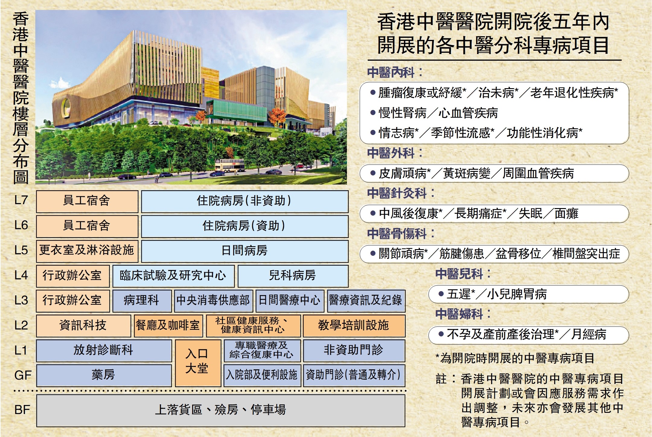 香港中醫醫院開院後五年內開展的各中醫分科專病項目、香港中醫醫院樓層分布圖