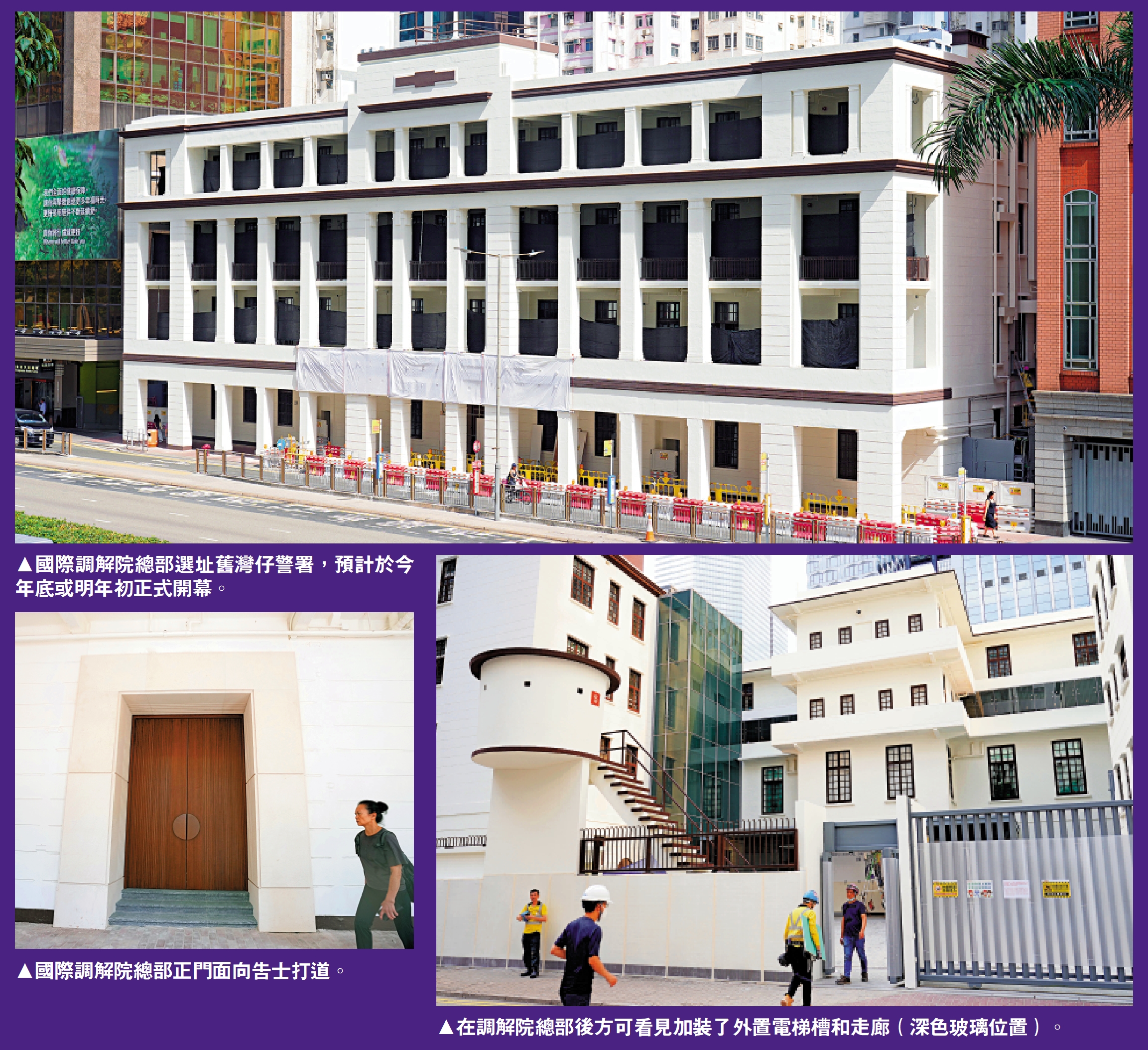 張國鈞透露,特區政府已成立跨部門小組,務求做好簽署儀式當日的相關安排。國際調解院總部選址舊灣仔警署,預計今年底或明年初正式開幕。大公報記者日前到位於舊灣仔警署現場,發現警署外牆原先的藍色裝飾線條已改為啡色。臨告士打道一面的正門上方的文字亦被遮擋;而在臨謝斐道一面已加裝了電梯,二層新增了玻璃窗走廊。