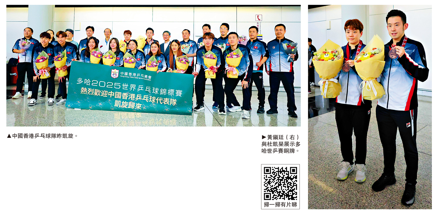 中國香港乒乓球隊於上周出戰2025年多哈世界乒乓球錦標賽,當中搭檔了12年的混雙組合「黃杜配」黃鎮廷/杜凱琹為港乒取得銅牌,大軍昨天在總教練李靜帶領下凱旋。與拍檔4獲世乒賽混雙銅牌的杜凱琹表示,將會專心備戰今年11月舉行的粵港澳全運會,希望屆時能夠發揮應有水準,並於成績上有所突破,首摘全運獎牌。\大公報記者 朱家立(文、圖)