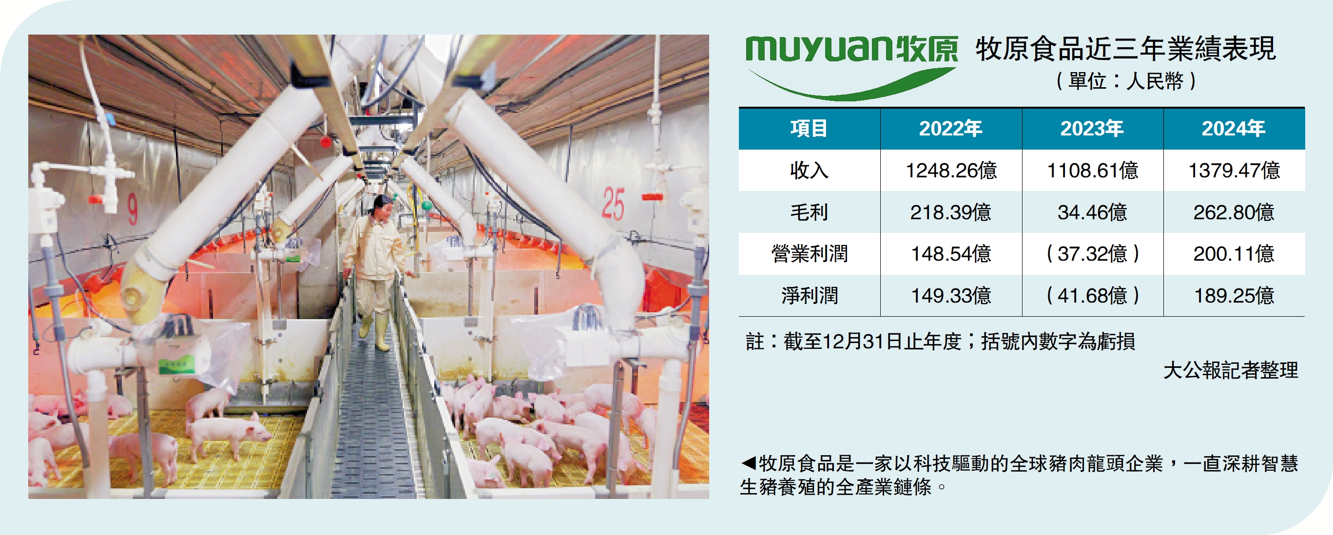 業績方面,公司去年收入錄得1379.47億元,按年升24.43%;毛利262.80億元,按年增長約6.62倍;2024年全年淨利潤189.25億元,較2023年虧損41.68億元大幅改善。根據招股書,生豬業務為公司收入的主要來源,近3年佔比均超過95%;以2024年為例,相關收入達1362億元,佔總收入的98.7%。