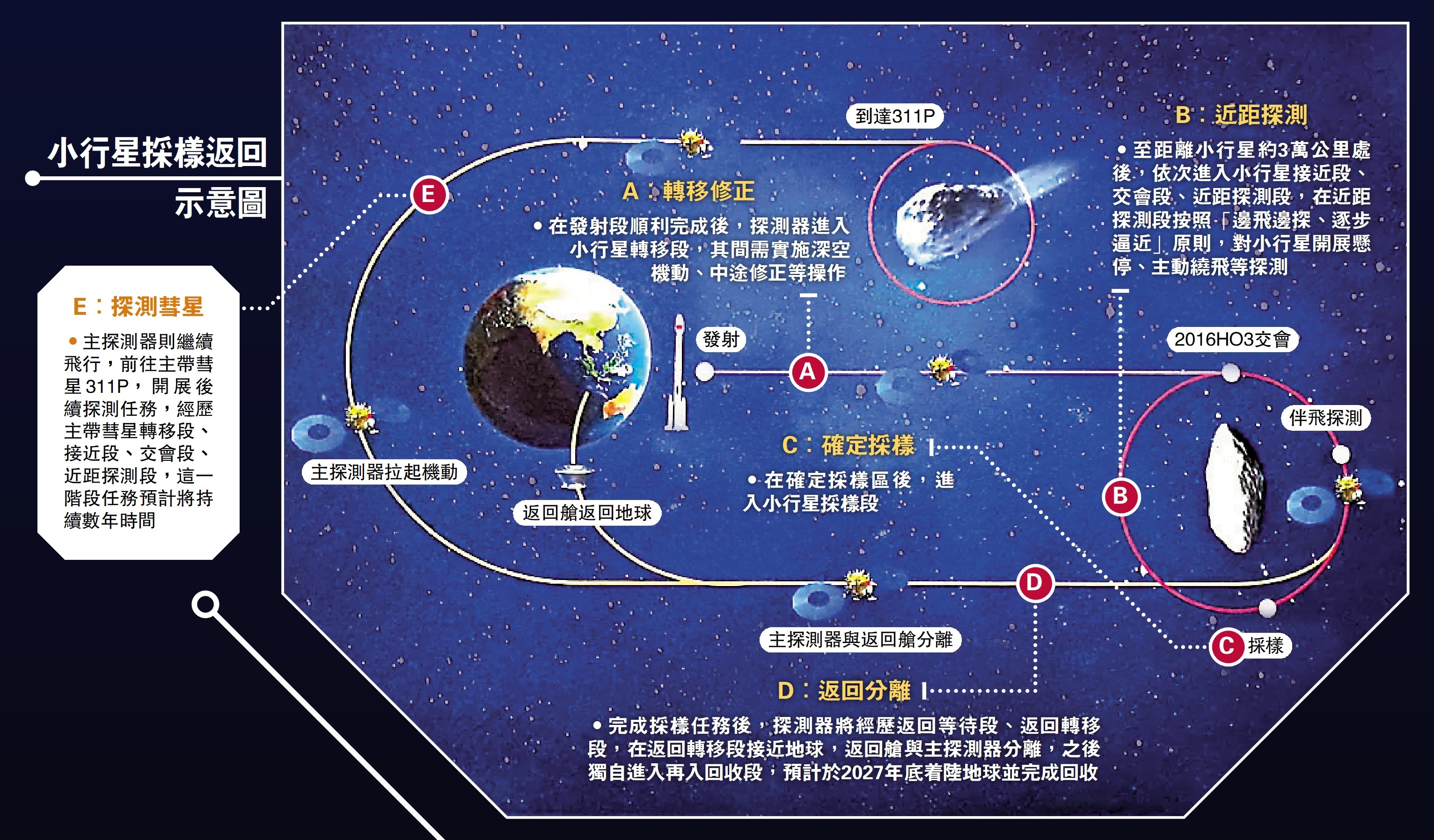據國家航天局介紹,天問二號任務技術難度大,工程風險高,共包含13個飛行階段。其中,僅小行星探測和採樣返回就包括9個階段。發射段順利完成後,探測器進入小行星轉移段,這一階段將持續約1年,其間需實施深空機動、中途修正等操作,直至距離小行星約3萬公里處。隨後依次進入小行星接近段、交會段、近距探測段,在近距探測段按照「邊飛邊探、逐步逼近」原則,對小行星開展懸停、主動繞飛等探測,確定採樣區後進入採樣段。完成採樣任務後,探測器將經歷返回等待段、返回轉移段,在返回轉移段接近地球,返回艙與主探測器分離,之後獨自進入再入回收段,預計於2027年底着陸地球並完成回收。此後,主探測器則繼續飛行,前往主帶彗星311P,開展後續探測任務。