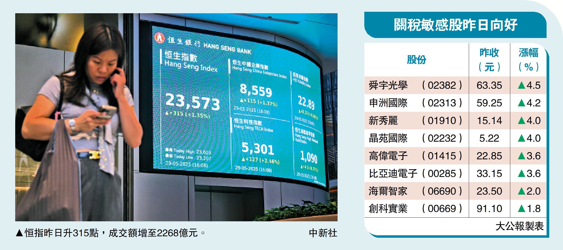 美國聯邦國際貿易法院叫停「對等關稅」後,特朗普政府隨即提出上訴。關稅加徵措施存在變數,亞太區股市普遍做好,恒指昨日升315點,收報23573點。主板成交額2268億元,較上日增加460億元。南下資金增量入市,港股通全日淨買入金額達43.81億元,較上日增加8.04億元。全日上升股份1172隻,下跌股份579隻。