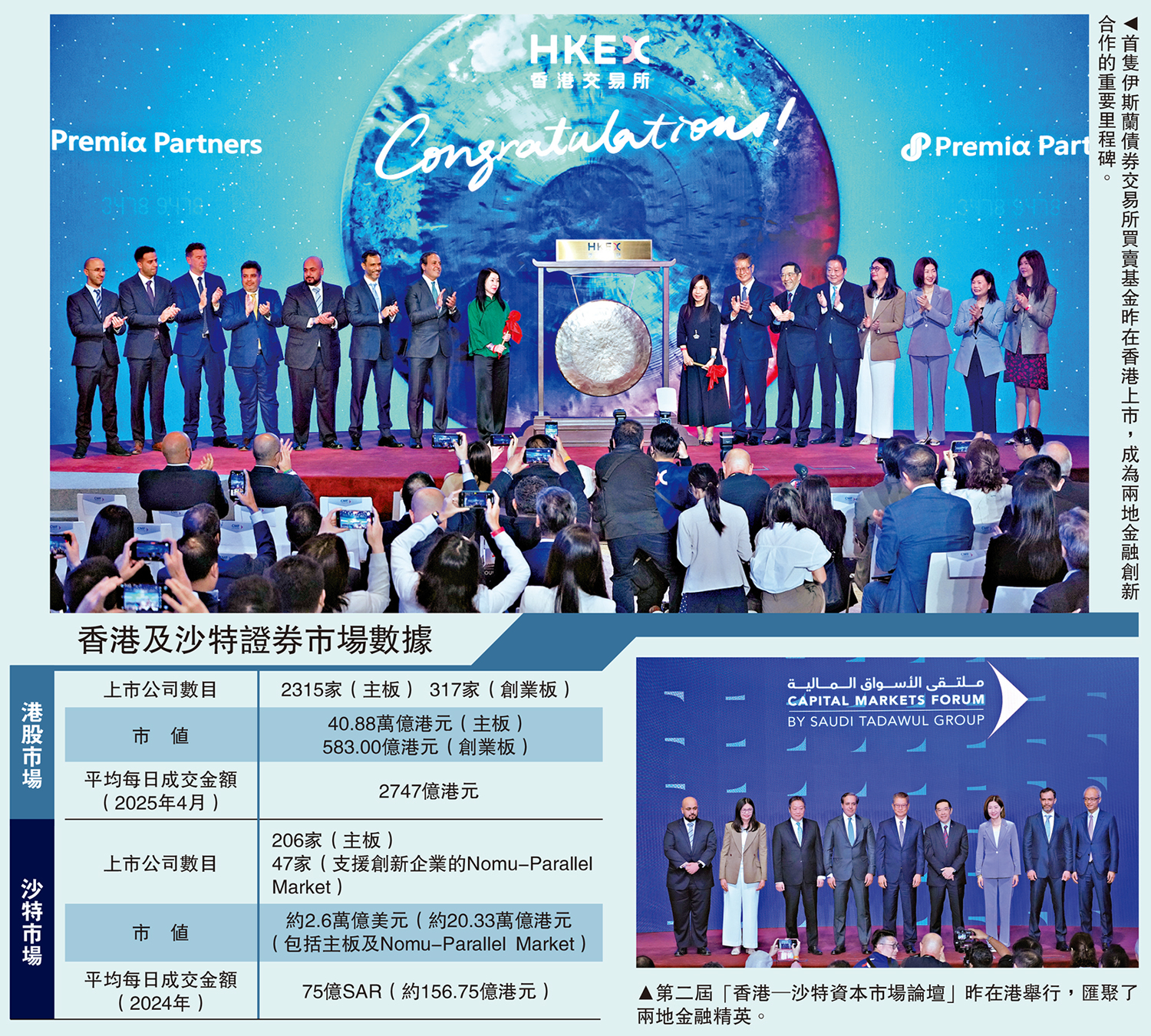 港交所(00388)與沙特證交所集團合辦的第二屆「香港─沙特資本市場論壇」昨日在香港舉行,論壇匯聚了兩地金融精英,共同探討亞洲、中東乃至全球資本市場的發展格局與投資機遇。其間,首隻伊斯蘭國債交易所買賣基金(ETF)在香港正式上市,成為兩地金融創新合作的重要里程碑。財政司司長陳茂波在論壇上表示,香港將開發更多符合伊斯蘭教義的金融產品,協助沙特實現經濟多元化。另外,港交所計劃年內在利雅得設辦事處,進一步深化合作。\大公報記者 麥晉瑋(文) 蔡文豪(圖)