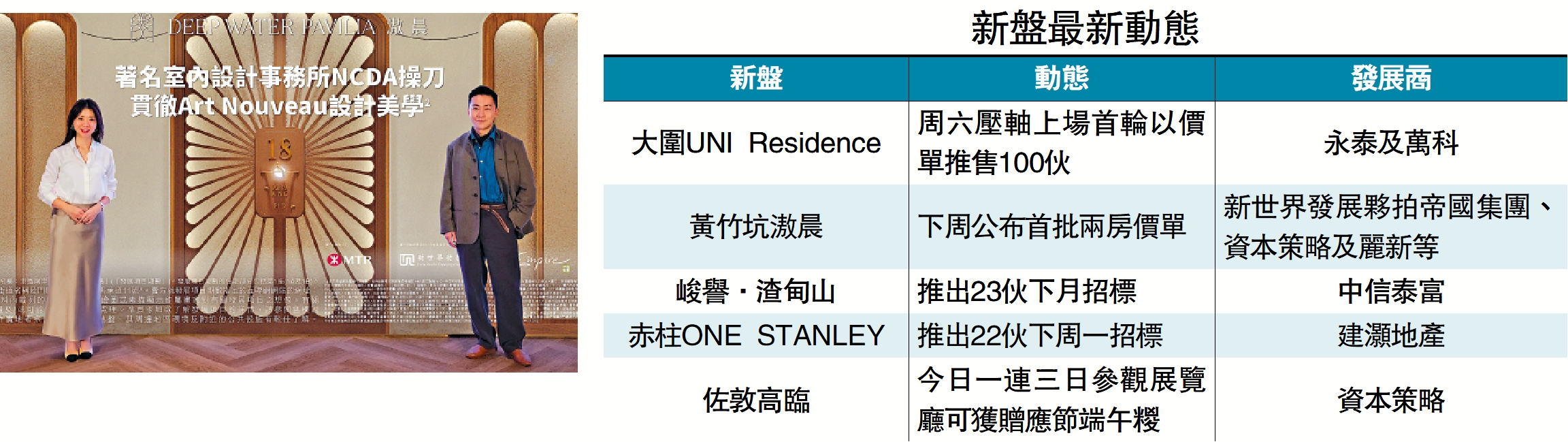 至於屬本月全新盤由新世界發展(00017)夥拍帝國集團、資本策略(00497)及麗新(00488)合資的黃竹坑站滶晨,趁市旺加快推盤步伐,落實最快下周以價單形式推售兩房單位。