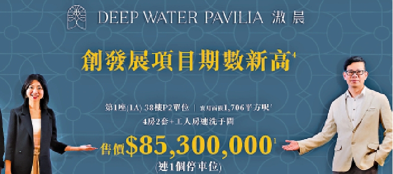 【大公報訊】一手氣氛熾熱,新盤售價屢創新高。新世界發展(00017)、麗新(00488)、資策(00497)及帝國等合資的黃竹坑港島南岸滶晨5日2度破頂。1伙4房大單位連1個車位沽8530萬元,呎價5萬元,雙雙再創項目及港島南岸分層戶歷史新高,呎價較上個紀錄4.7萬元再推高6.4%。