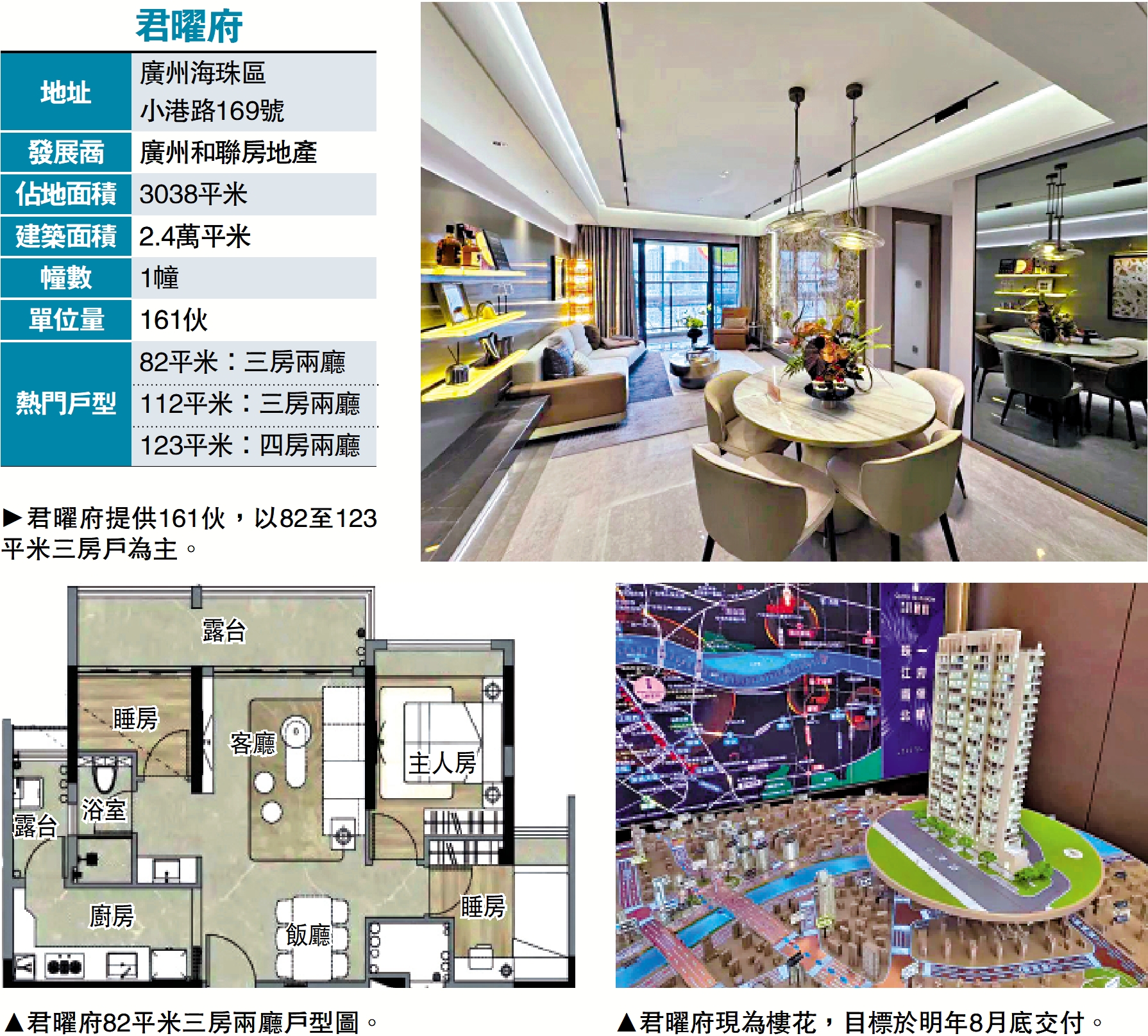 記者了解到,君曜府以準現樓形式在今年登場,目標於2026年8月底交付。項目為單幢物業,提供161伙,以82至123平米三房戶為主力,提供東南、西南及西北朝向選擇。其中,西北朝向單位無遮擋,夜間可遠眺珠江前航道夜景。