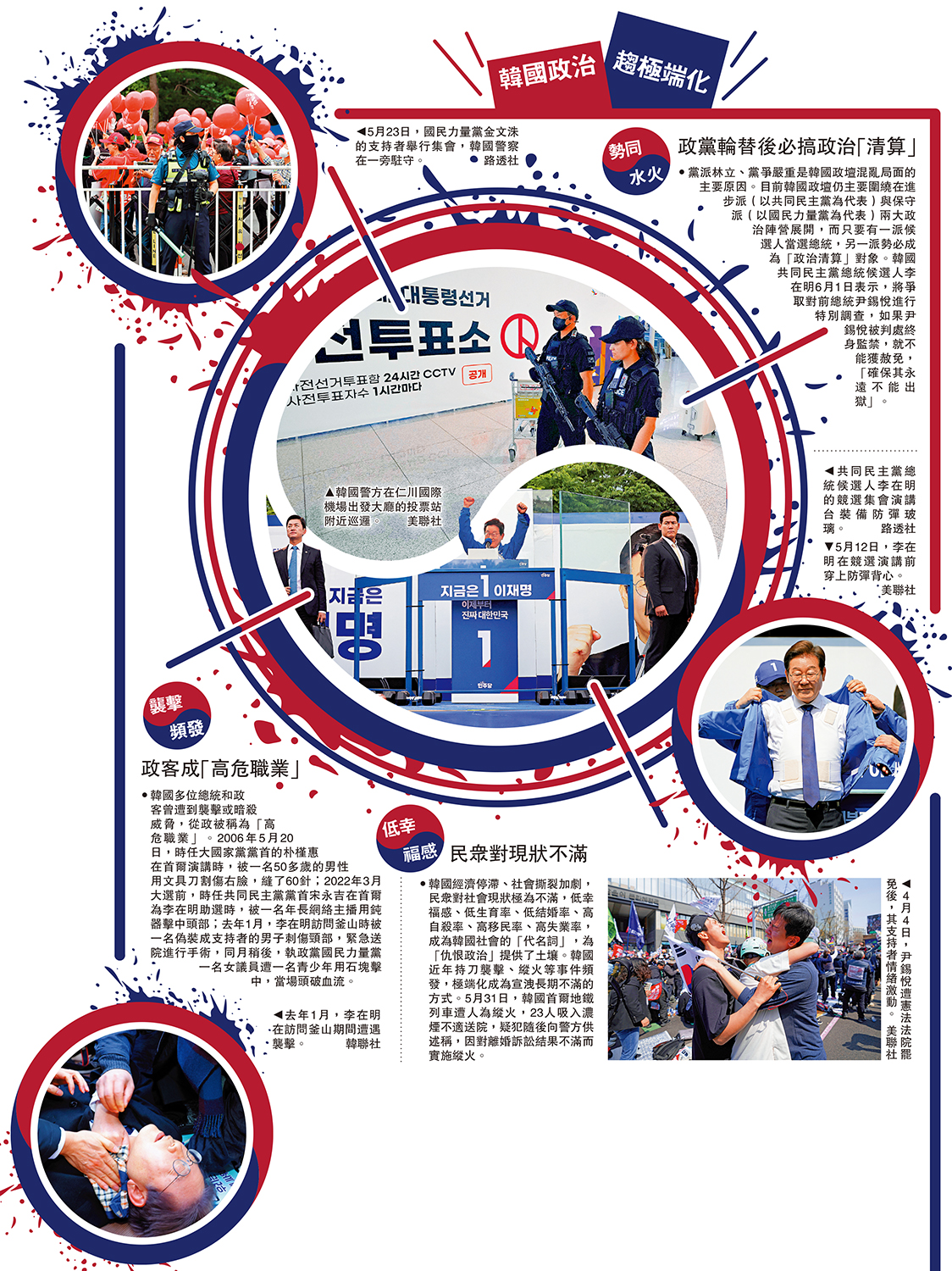 •黨派林立、黨爭嚴重是韓國政壇混亂局面的主要原因。目前韓國政壇仍主要圍繞在進步派(以共同民主黨為代表)與保守派(以國民力量黨為代表)兩大政治陣營展開,而只要有一派候選人當選總統,另一派勢必成為「政治清算」對象。韓國共同民主黨總統候選人李在明6月1日表示,將爭取對前總統尹錫悅進行特別調查,如果尹錫悅被判處終身監禁,就不能獲赦免,「確保其永遠不能出獄」。