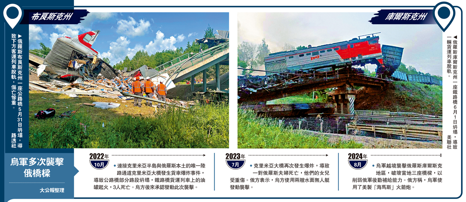 俄方橋樑已多次成為烏軍襲擊目標。2022年和2023年,烏方兩度對連接克里米亞半島與俄本土的克里米亞大橋發動爆炸襲擊。去年8月,烏軍越境襲擊庫爾斯克後不久便接連破壞當地三座橋樑,以削弱俄軍後勤補給能力。