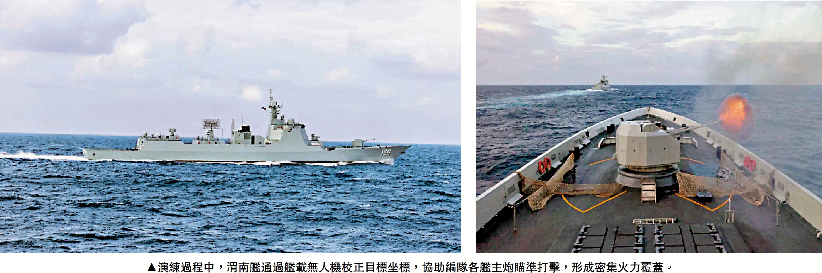 訓練中,渭南艦通過艦載無人機校正目標坐標,並將目標屬性推送至編隊,各艦主炮交替實施打擊,形成密集火力覆蓋,命中「敵」方岸基殘存火力點。\大公報記者 葛沖
