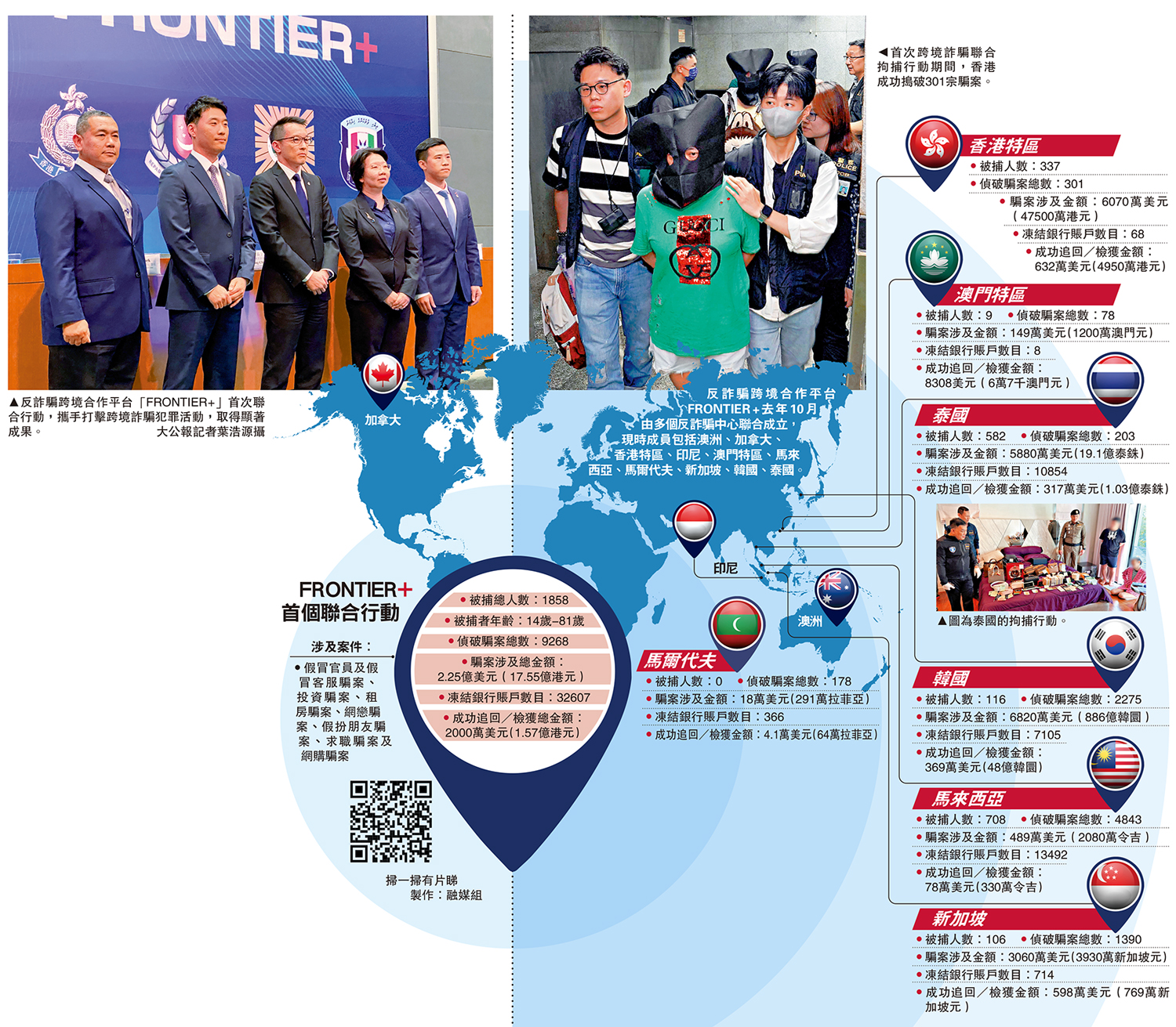由香港和多個國家及地區的執法部門聯合成立的反詐騙跨境合作平台「FRONTIER+」,於今年4月底至5月底展開了首次跨境詐騙聯合拘捕行動,在短短一個月內各地一共拘捕1800多人,涉及9200多宗詐騙案件,涉款逾17.5億港元。當中,有新加坡事主受騙匯款約400萬港元至香港銀行賬戶,兩地警方合作成功攔截全數騙款。