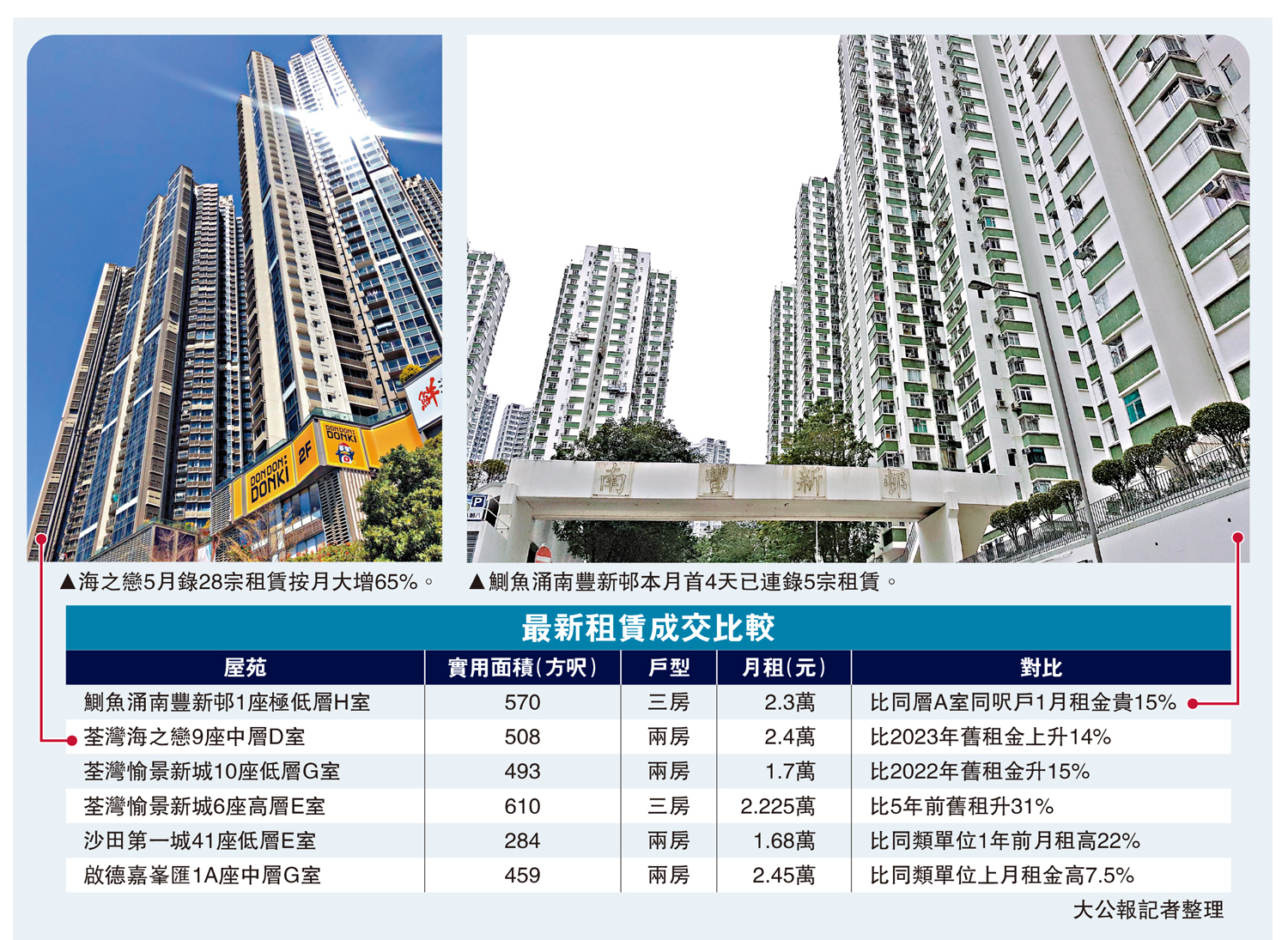 暑假租務旺季將至,為免缺盤,內地生及專才紛紛趕高峰期前租樓,帶動多區租賃成交急增,租金明顯攀升,備受中產青睞的鰂魚涌區,上月租賃急增約六成,其中南豐新邨低層三房單位月租達2.3萬元,較同層三房戶今年1月租金飆升15%;荃灣區租賃交投亦旺,區內新晉屋苑海之戀兩房戶月租攀至2.4萬元,較2年前舊租反彈14%。\大公報記者 林惠芳