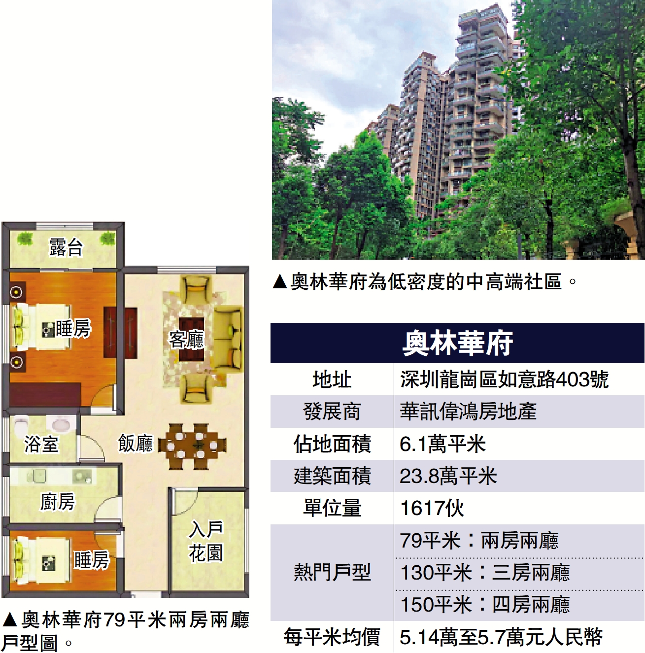 奧林華府坐落龍崗區大運新城核心區,緊鄰大運體育中心與地鐵16號線龍城公園站,為低密度的中高端社區。屋苑分四期開發,集住宅、商業、教育於一體,共1617伙。單位每平米均價5.14萬至5.7萬元(人民幣,下同),較龍崗中心城商圈樓盤每平米均價3.7萬元高出逾五成,主要是得益於生態及學區價值。