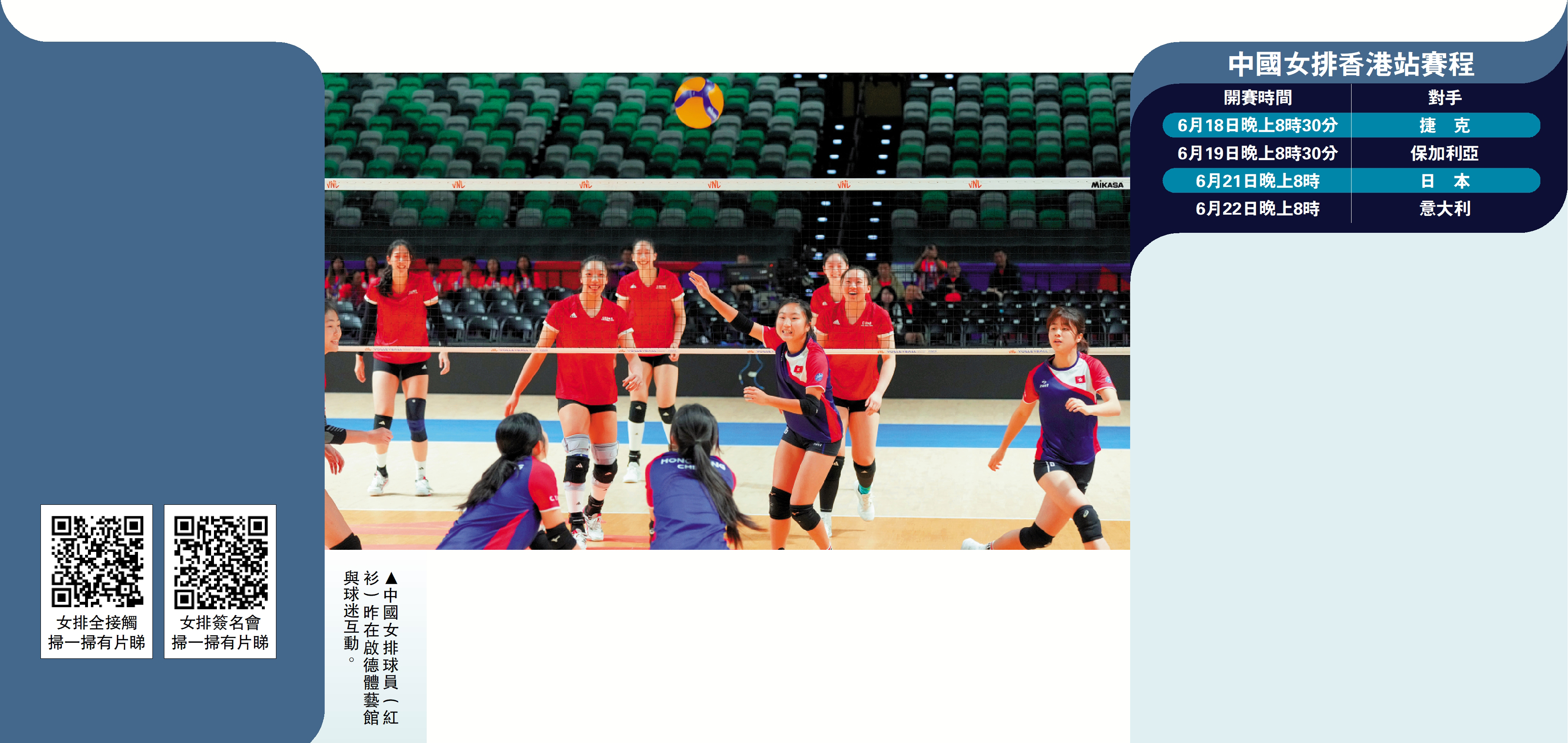 年度體育盛事世界女排聯賽香港站將於本周三至周日首度在啟德體育園體藝館舉行,備受香港球迷支持的中國女排將在本站賽事征戰4仗。中國女排昨午抵港後,馬不停蹄地出席晚間的「賽馬會社區排球計劃─中國女排全接觸」及中國女排簽名會兩項活動。雖然球員因舟車勞頓而略顯疲態,但仍面帶笑容與球迷打成一片、親切聊天,簽名、合照更是有求必應,全方位滿足粉絲們的要求,獲得球迷激讚。\大公報記者 張銳(文)、林良堅(圖)