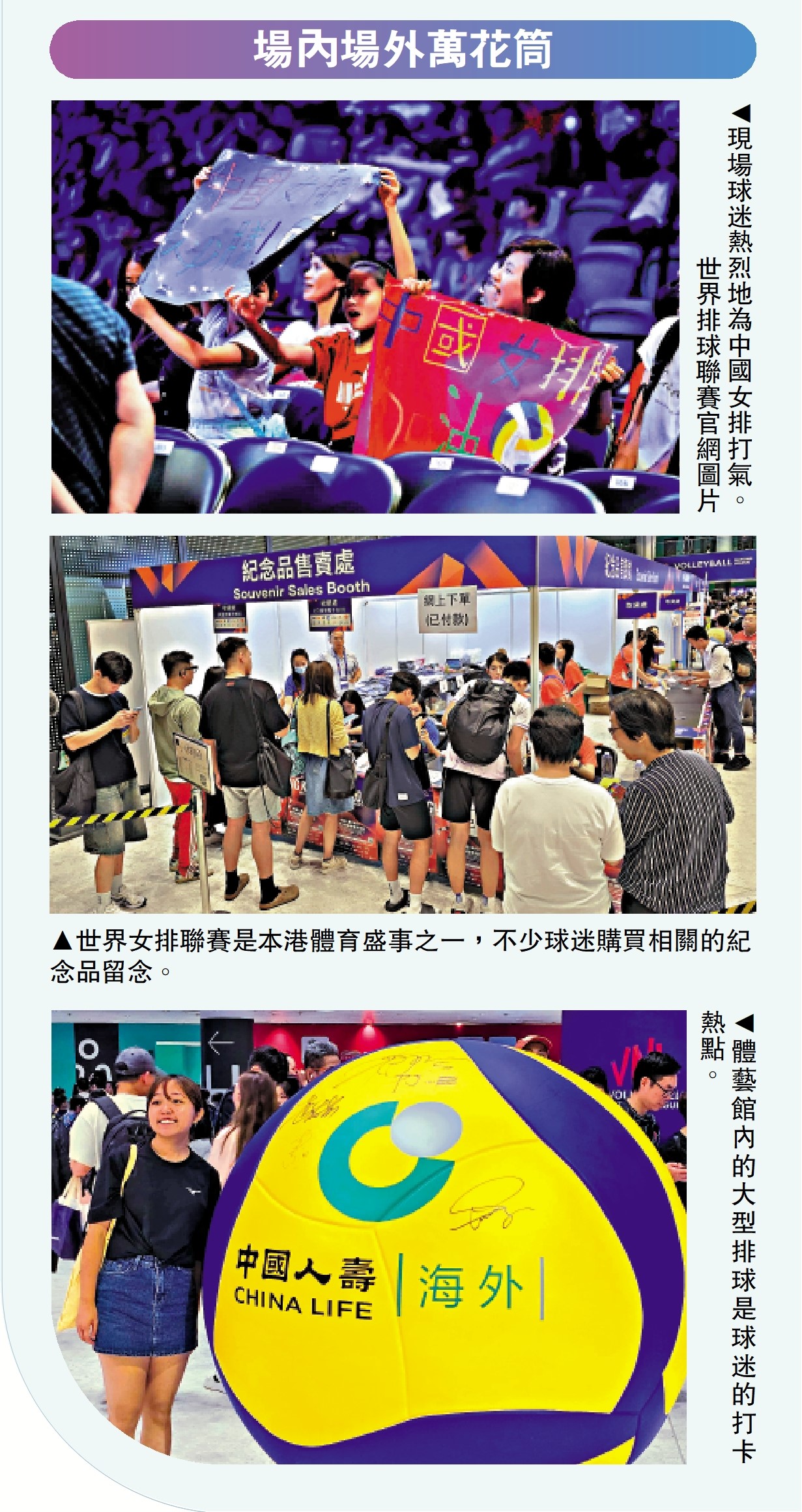 上圖:現場球迷熱烈地為中國女排打氣。\世界排球聯賽官網圖片;中圖:世界女排聯賽是本港體育盛事之一,不少球迷購買相關的紀念品留念。下圖:體藝館內的大型排球是球迷的打卡熱點。