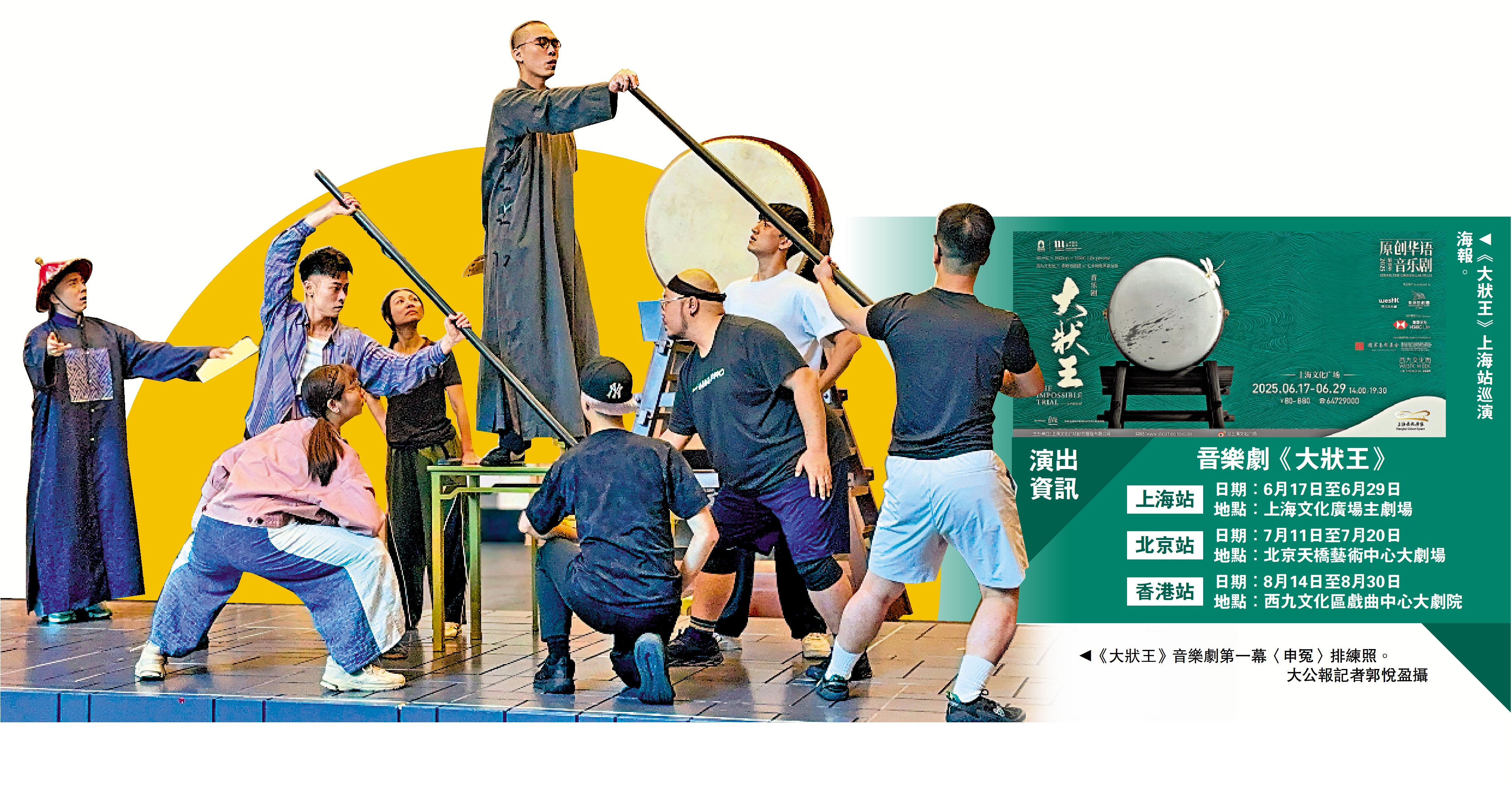 歷時近十年打磨,由西九文化區委約創作、香港話劇團製作的原創粵語音樂劇《大狀王》,現正展開為期兩個半月的巡演,首站隨「西九文化周」首度登陸上海,之後移師北京,8月中旬回歸香港第三度公演。這次巡演不僅有19位新演員加入,更首次採雙卡司制演繹,導演方俊杰形容這是風格截然不同的雙重嘗試。香港站早鳥優惠門票日前開售,首日即全數售罄,主辦方隨即加開7場演出。方俊杰近日與部分演員接受大公報記者訪問,分享選角考量與演出籌備的幕後點滴。/大公報記者 郭悅盈
