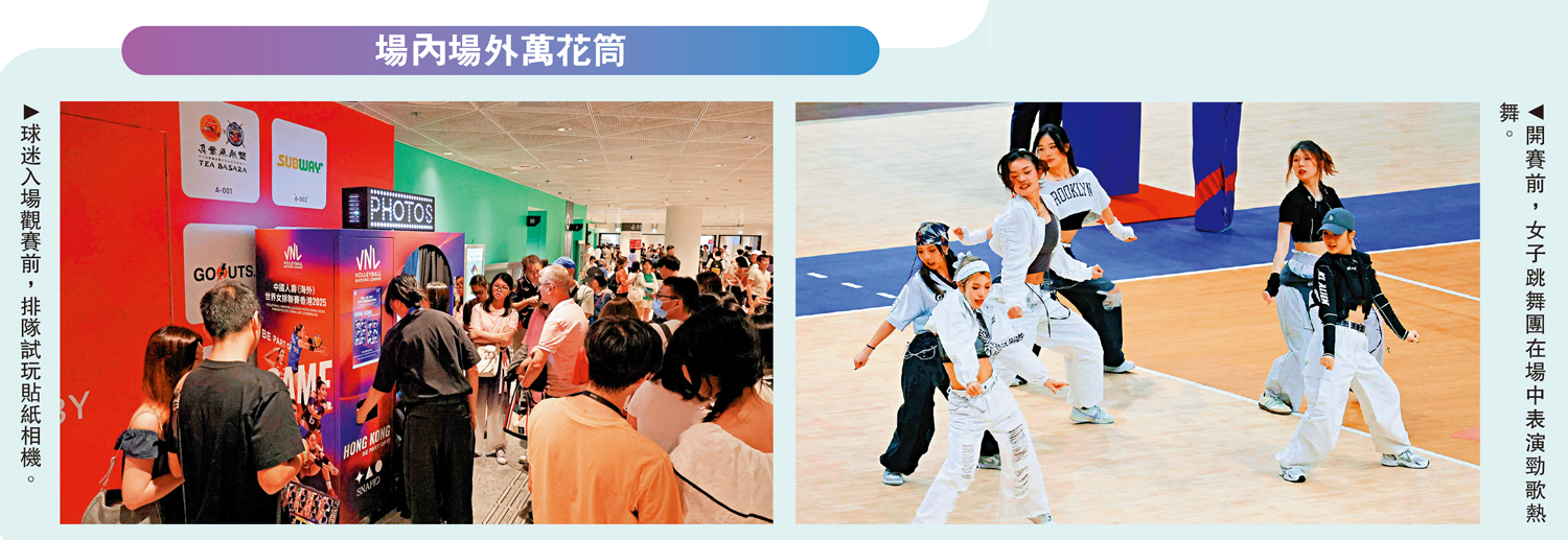 左圖:球迷入場觀賽前,排隊試玩貼紙相機。右圖:開賽前,女子跳舞團在場中表演勁歌熱舞。