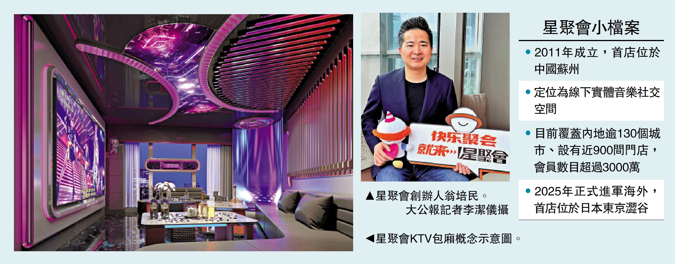 再有內地品牌連鎖店攻港!KTV營運商星聚會早前公布在蘭桂坊開設首店,創辦人翁培民接受《大公報》專訪時表示,面對內地KTV行業「內捲」情況趨激烈,「出海」是必須選項。他提到,除了中環亦在銅鑼灣開店,預計香港店舖回本期約3年,目標兩年內在港設有4至5間分店。\大公報記者 李潔儀