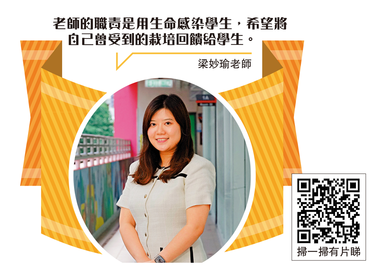 課內,為了能讓學生更投入課堂,梁妙瑜的教學方式可謂活潑生動。最近課本內容剛好教到「虎門銷煙」,她便一改課堂形式,運用戲劇教學法舉辦了一場「記者招待會」,讓同學們扮演林則徐、記者、民眾等不同的角色,讓各人以不同持份者的角度參與其中,加深對課文的理解。作為一名年輕老師,她又結合資訊科技,例如讓學生用AI呈現自己編寫的中國歷史人物演講稿,激發學習興趣。她又推動中文科校本課程,如古詩文學習冊,加入古文小學堂、比較閱讀題等內容,還運用創意思維策略,帶領團隊參加比賽,不論輸贏,她更希望根據評判意見優化課程。