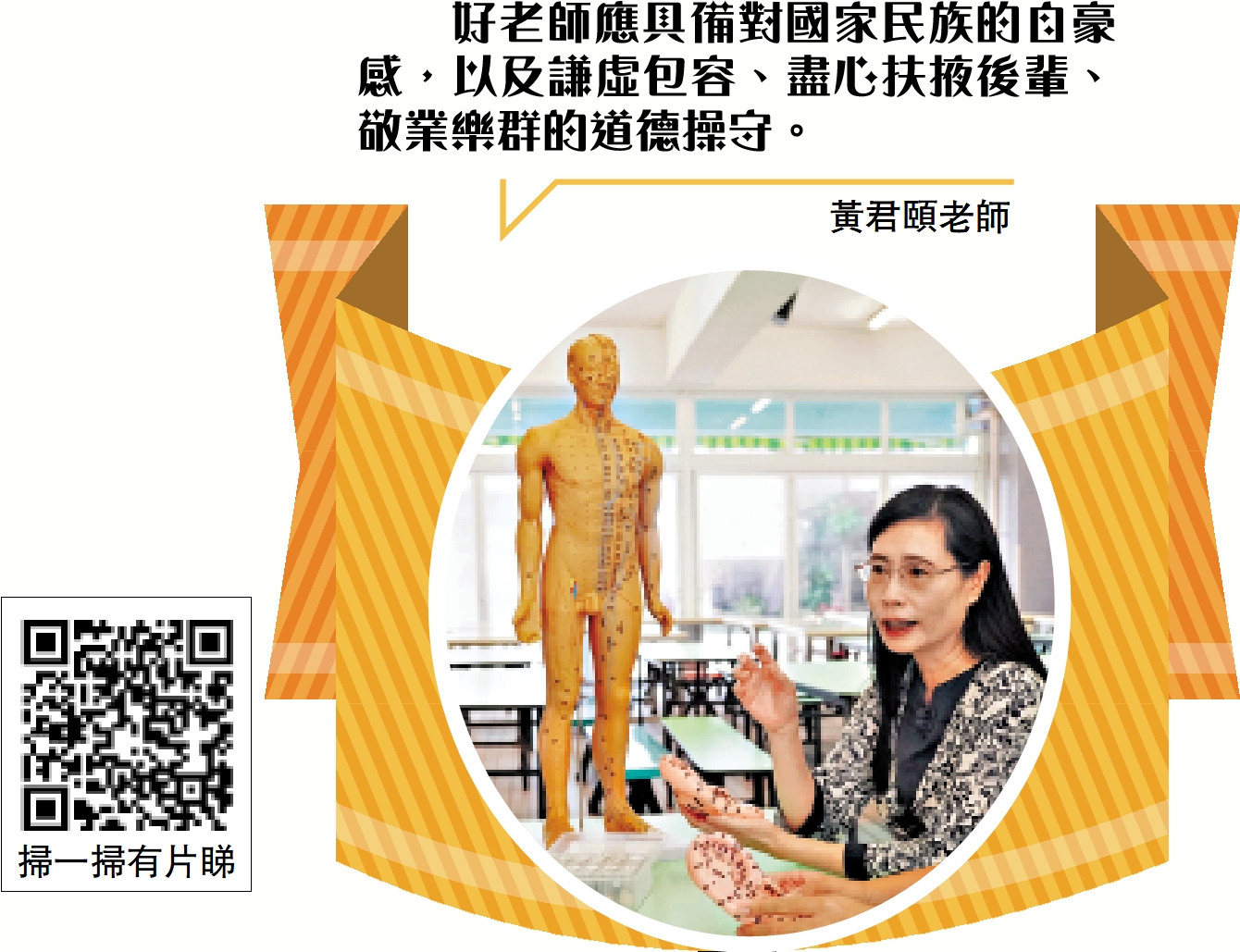 「正氣存內,邪不可干。」這句出自中醫典籍《黃帝內經》中養生保健的精髓,便是第二屆「香港優秀師德師風獎評選」優秀獎教師、中華基督教會方潤華中學老師黃君頤的教學座右銘。執教逾36年來,她一直以愛學生勝於愛自己的心,秉持「正氣長存」的信念,期望學生在紛擾世代中保持正直,並致力推廣中醫藥文化,目的是讓學生懂得自我保健,從而孝順父母,及日後成為社會的棟樑!