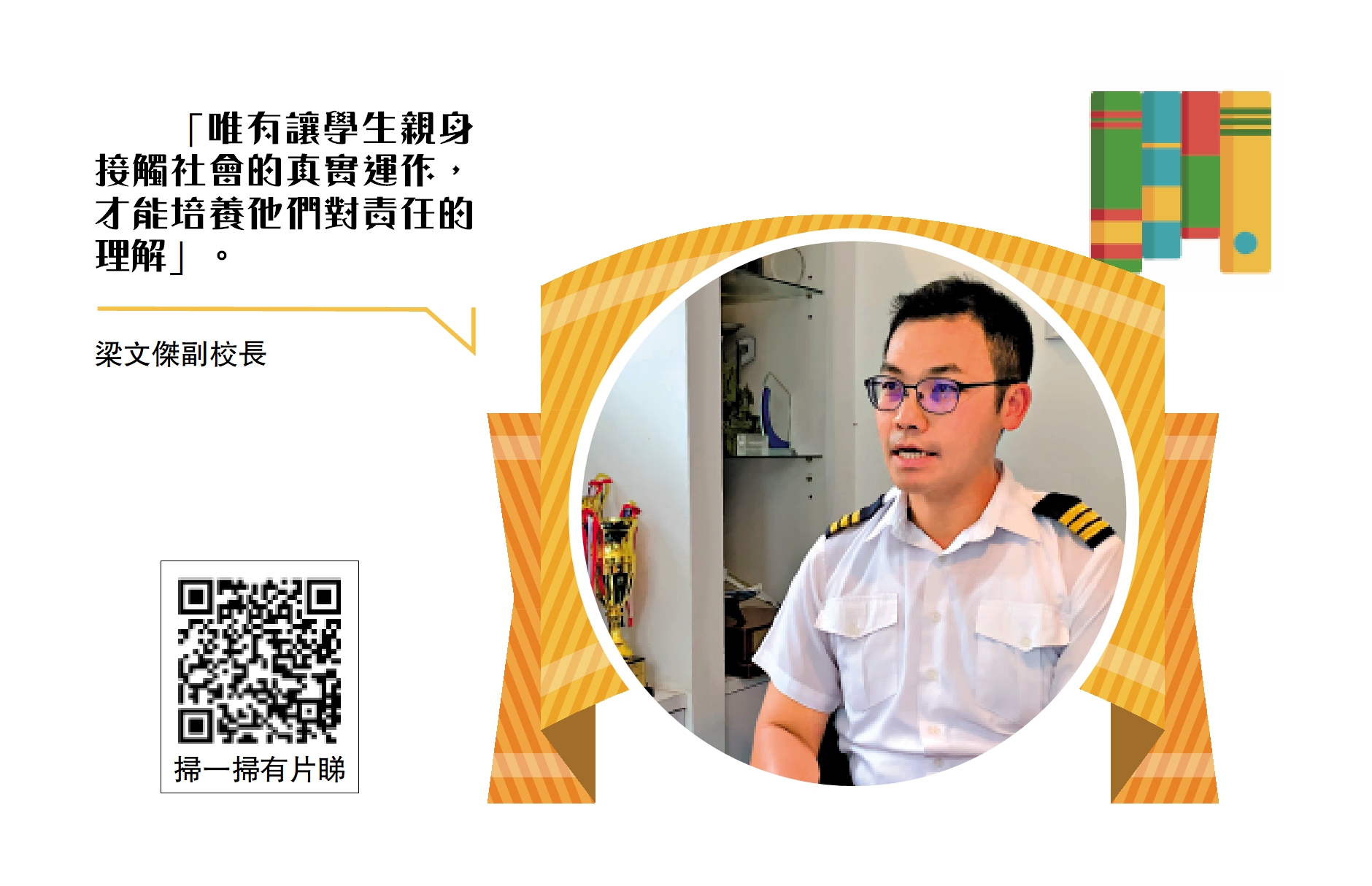 陶行知先生曾經說過:「千教萬教,教人求真;千學萬學,學做真人。」梁文傑副校長深以為然,他永遠把學生的道德教育放在首位,致力於引導學生成為正直、有擔當的「真人」。而道德教育的核心便是愛國愛港教育。為了培養學生對國家文化的尊重,從2021年開始,梁文傑副校長就要求全校教職員參與中式步操訓練,通過老師以身作則去影響學生;同時在校內成立升旗隊,在每個大型活動上都舉行升旗儀式,讓學生在儀式中感受國民教育的信念。除此以外,梁文傑副校長還以「以行踐知」的方式,在社會實踐中培養學生的國民責任感。例如,他曾推薦學生參加「與香港同行」計劃,讓學生跟隨保安局鄧局長實習三天。梁文傑副校長表示:「唯有讓學生親身接觸社會的真實運作,才能培養他們對責任的理解。」