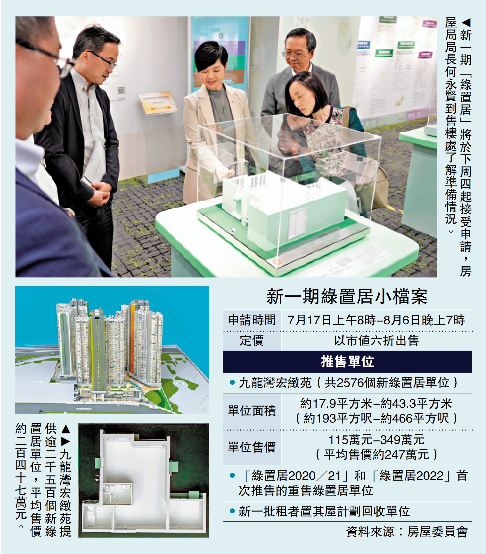 房屋委員會新一期「綠置居」將於下周四(17日)開始接受申請,以市價六折出售,新推售的九龍灣宏緻苑合共2576個單位,售價介乎115萬至349萬元。房屋局局長何永賢表示,若以面積最小的單位戶型計算,平均售價僅約128萬元,約20萬元就可「上車」。由今期綠置居開始,放寬對曾撻訂的公屋住戶的24個月禁購期限制,簽約時沒擁有住宅物業,就可申請資助出售房屋。關注房屋團體認為,解禁有助理順安排,鼓勵富戶置業後遷出公屋,同時不會令更多人撻訂,估計今期綠置居有逾5萬申請,料不會出現「賣剩蔗」情況。\大公報記者 王亞毛 曾敏捷