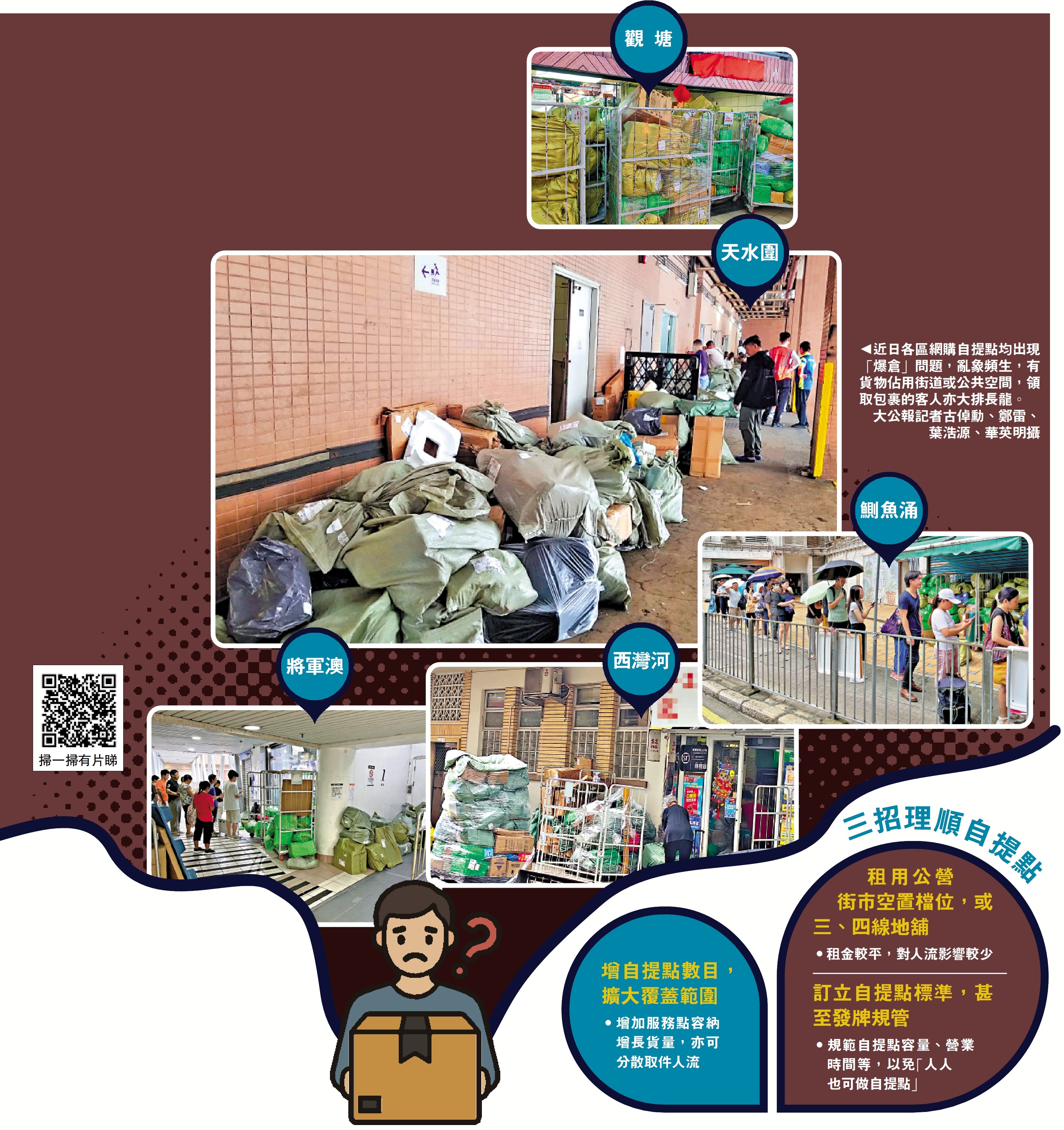 有議員建議增加提貨點完善配套,有學者倡設發牌制度規管;亦有地產業人士建議,善用公營街市長期空置的檔位,或選用租金較平的三、四線街道的舊唐樓地舖做自提點,解決亂象。\大公報記者 盛德文、葉浩源、古倬勳