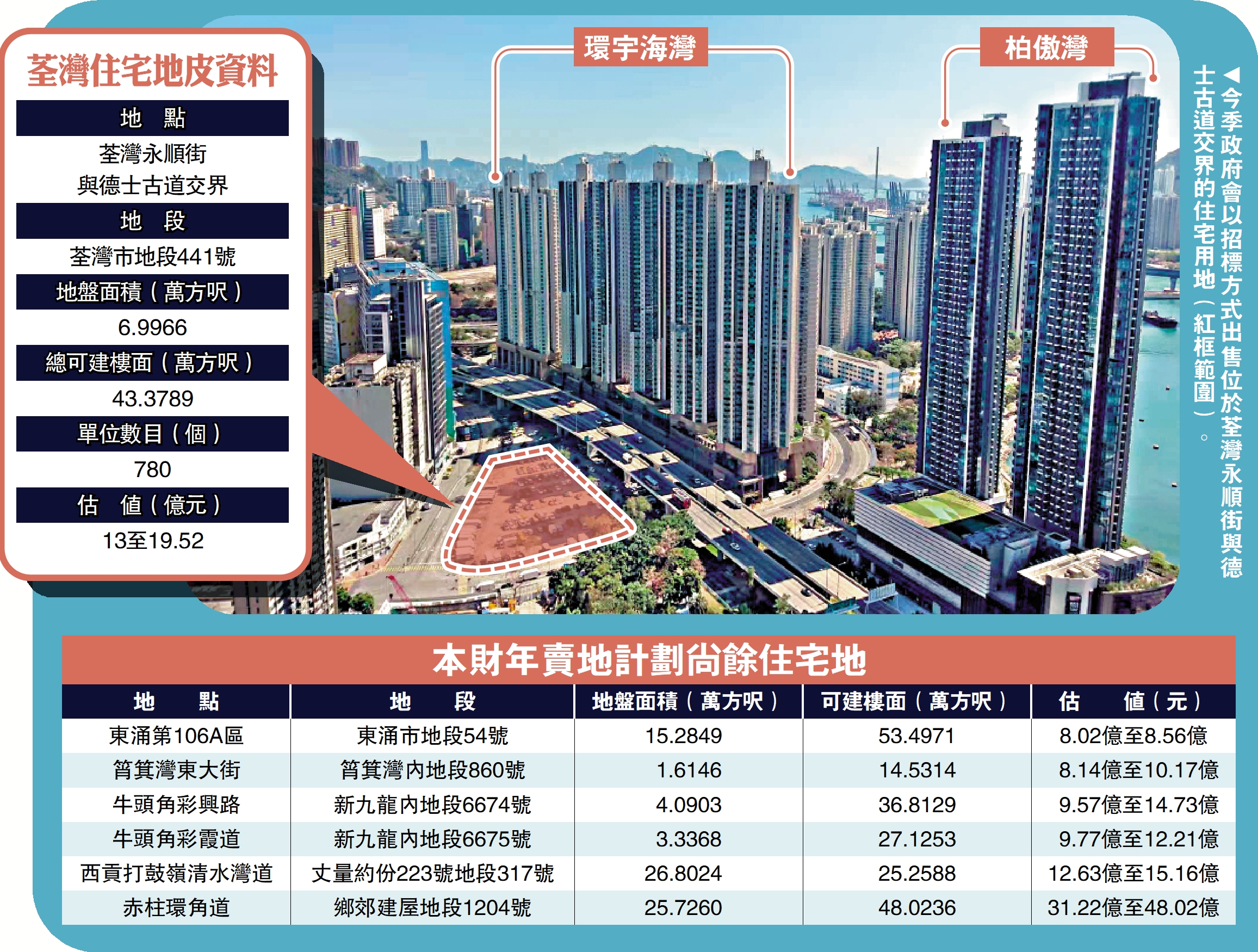 今年上半年本港樓市已漸偏穩,特區政府在出售土地仍會審時度勢而行,本季暫仍如之前數季般,維持只推出1幅荃灣住宅土地招標出售,涉780伙。但會視乎未來市況,不排除稍後季度會推出具規模及多推土地。而本財政年度首兩個季度賣地計劃預計可提供約6000伙,佔目標供應約45%;且對全財年賣地供應達標持審慎樂觀。\大公報記者 林志光