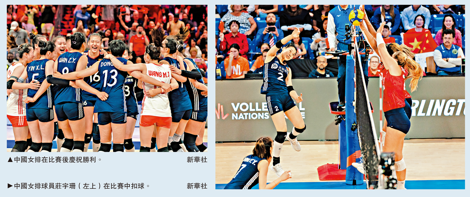 中國女排在13日進行的2025世界女排聯賽美國阿靈頓站上演大逆轉的好戲,在先失兩局的情況下3:2逆轉擊敗美國隊,以4連勝結束本站比賽。吳夢潔本場得到中國女排最高分27分,莊宇珊和龔翔宇分別貢獻18分和14分。中國女排主教練趙勇表示:「隊員每一場比賽都拚盡了全力,在很多被動情況下,最後完成逆轉取勝。」