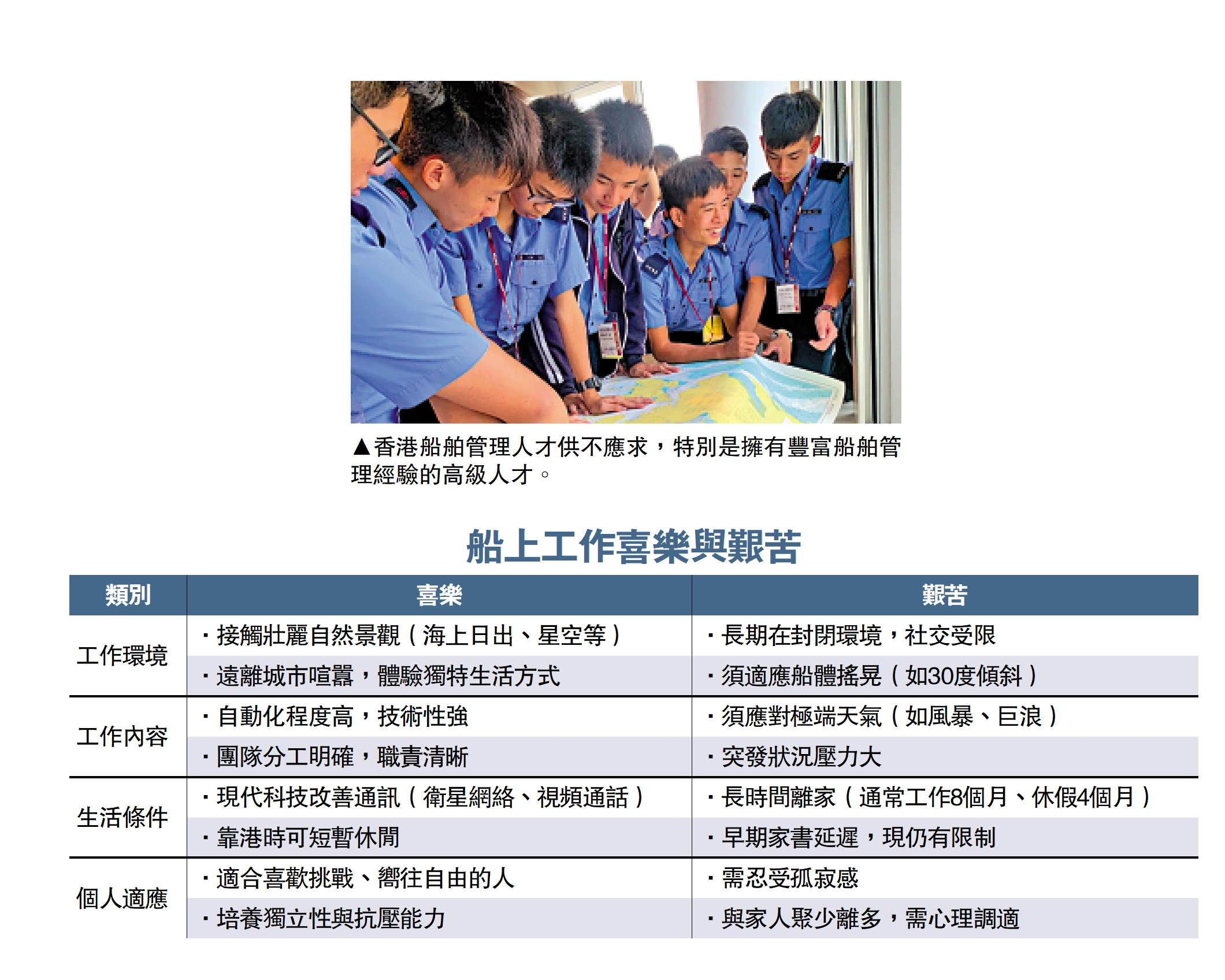 「船長就像巴士司機,但背後有兩套團隊。」招商輪船總輪機長吳建移以生動比喻解釋船舶分工:駕駛團隊(Deck Department)由船長、大副至三副4人組成,負責航行方向;輪機團隊(Engine Department)同樣4人,主管動力系統維護。其餘十餘名支持人員則協助日常運作,整船約20至25人,「再大的船也很少超過30人」。他笑稱,現代船舶自動化程度高,但船員仍需應對極端狀況,「遇30度搖晃時,暈船是必修課。」