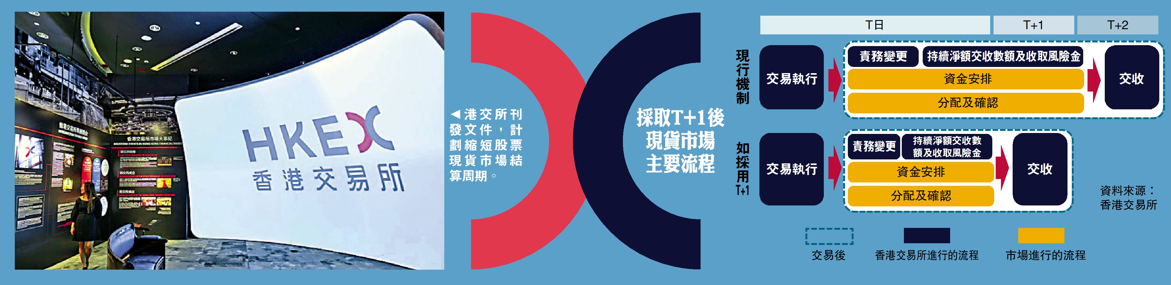 香港交易所(00388)昨刊發有關縮短股票現貨市場結算周期的討論文件,計劃把市場從現行「T+2」(交易日後兩個營業日結算)過渡至「T+1」,並邀請業界於9月1日前提交意見,惟預期需數年才能正式轉向「T+1」。港交所行政總裁陳翊庭強調:「全球金融市場的發展日新月異,我們不進則退。」事實上,結算周期作為股票現貨市場交易的重要基礎,全球主要市場正積極於此方面發展。\大公報記者 蔣夢宇