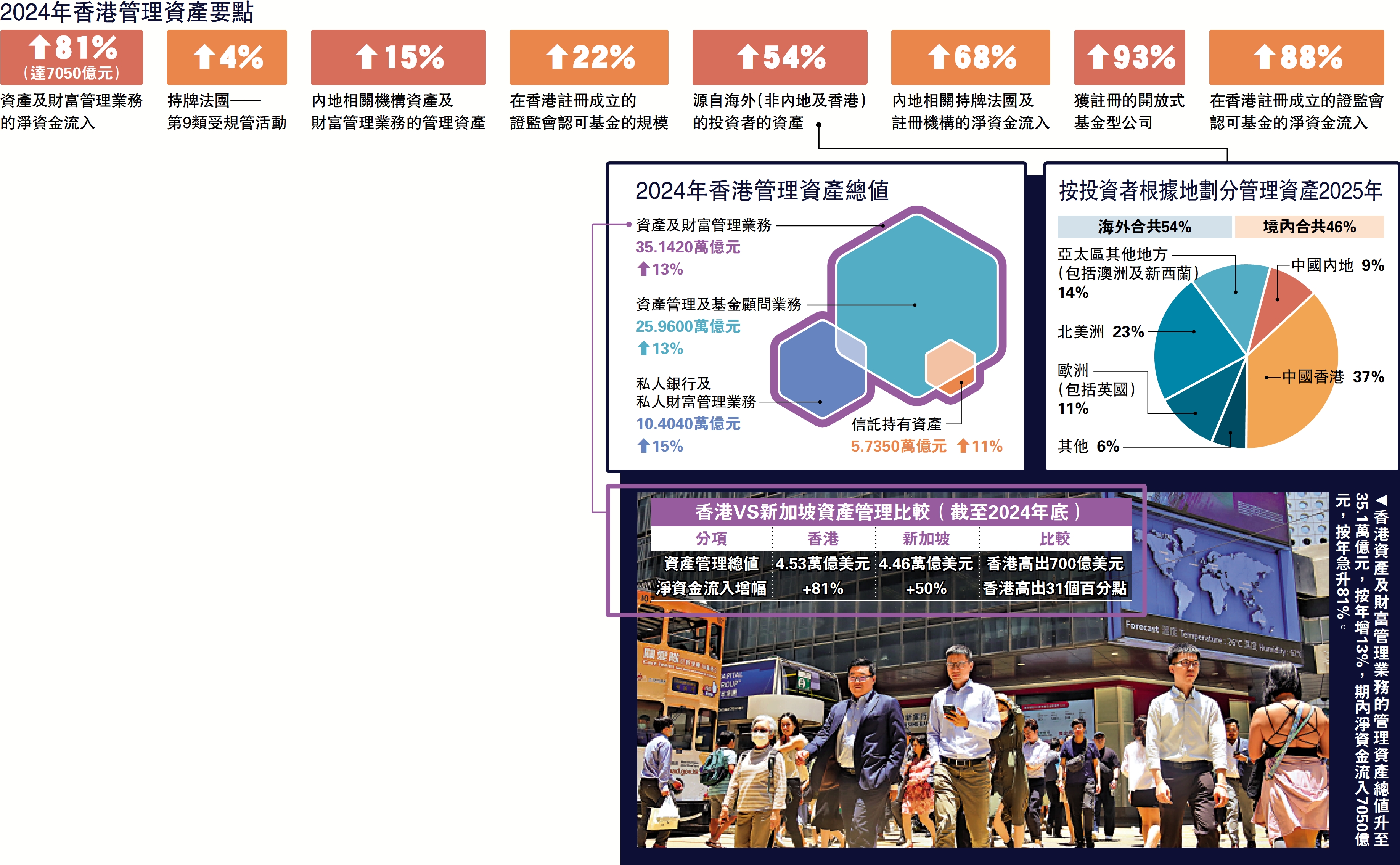 證監會昨日發布《2024年資產及財富管理活動調查》顯示,香港作為卓越的國際資產及財富管理中心表現亮眼,截至2024年底,香港資產及財富管理業務的管理資產總值升至35.1萬億元(4.53萬億美元),按年增13%,期內淨資金流入7050億元(910億美元),按年急升81%。另私人銀行及私人財富管理業務的分項,管理資產按年增長15%至10.4萬億元(1.3萬億美元)。