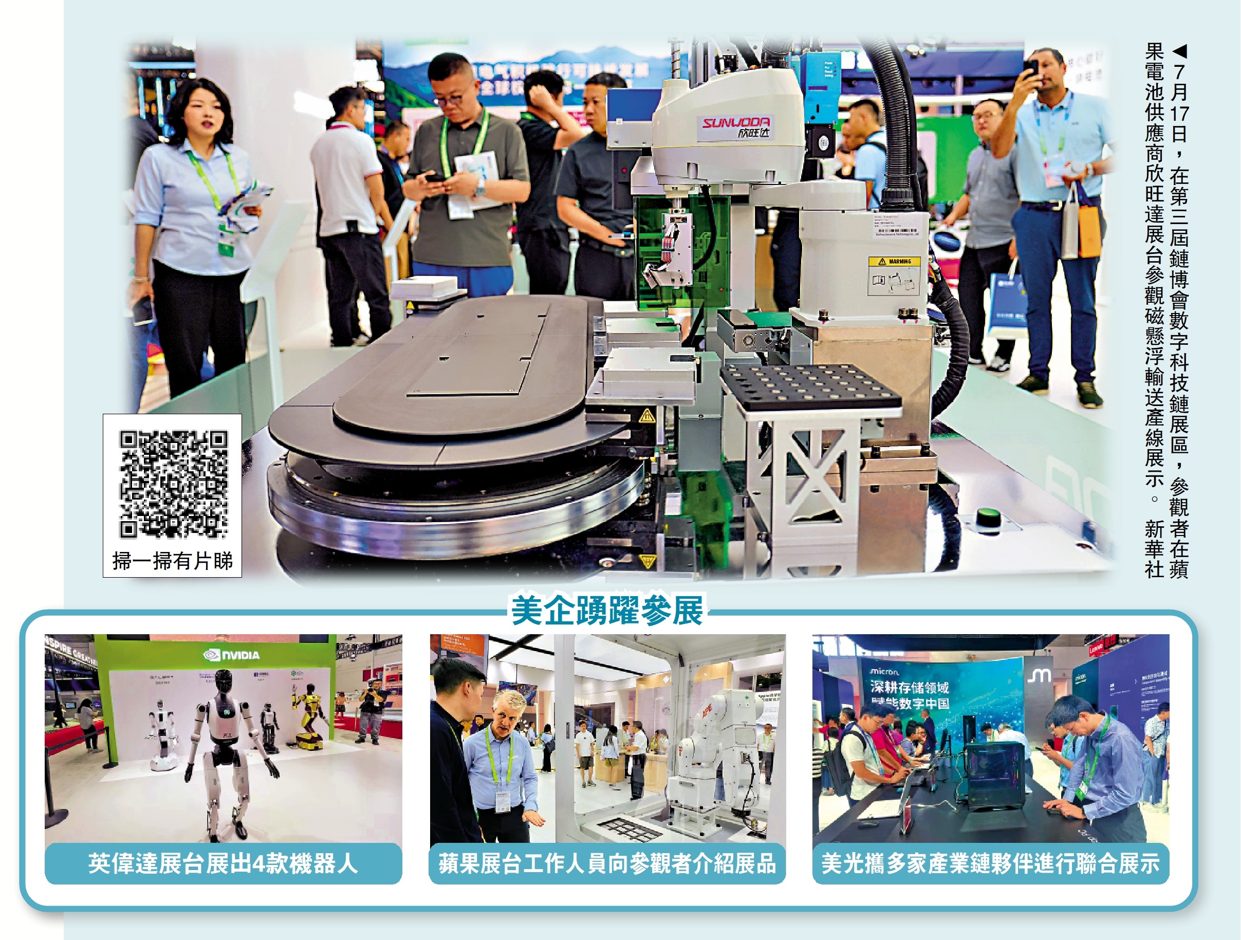 蘋果公司已連續三年參加鏈博會,繼續帶來中國本土供應鏈夥伴共同參展。蘋果對每年合作參展的供應商都有所側重,今年三家分別是欣旺達、山東創新和傑士德,展示綠色智能製造、再生能源等方面的成果。展台上,一款欣旺達研發的磁懸浮輸送產線吸人眼球。「相比於傳統的皮帶和轉盤系統,其提高輸送速度、定位精度和設備重複使用率。」展台相關負責人向大公報介紹,欣旺達新一代磁懸浮生產線已經實現了100%國產率。