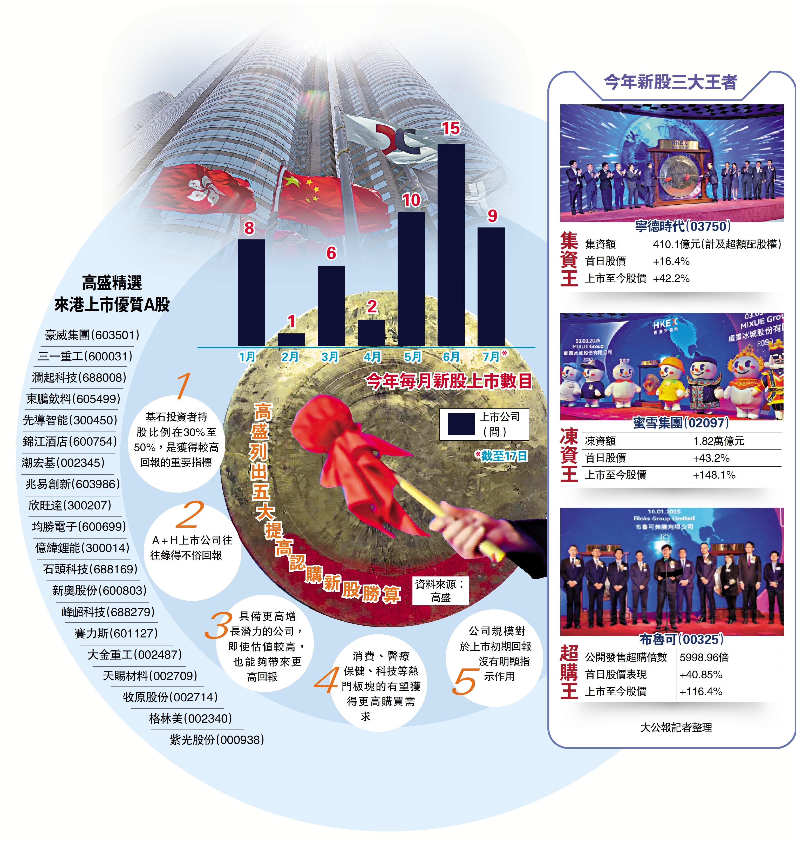 另外,高盛發現五個可以提高認購新股勝算的法則,第一是基石投資者持股比例在30%至50%;第二是A+H上市公司往往錄得不俗回報,目前至少有20家優質A股企業已宣布香港上市計劃;第三是具備更高增長潛力的公司,即使估值較高,也能夠帶來更高回報;第四是消費、醫療保健、科技等熱門板塊的往往獲得更高購買需求。最後,高盛提醒,公司規模對於上市初期回報沒有明顯指示作用。