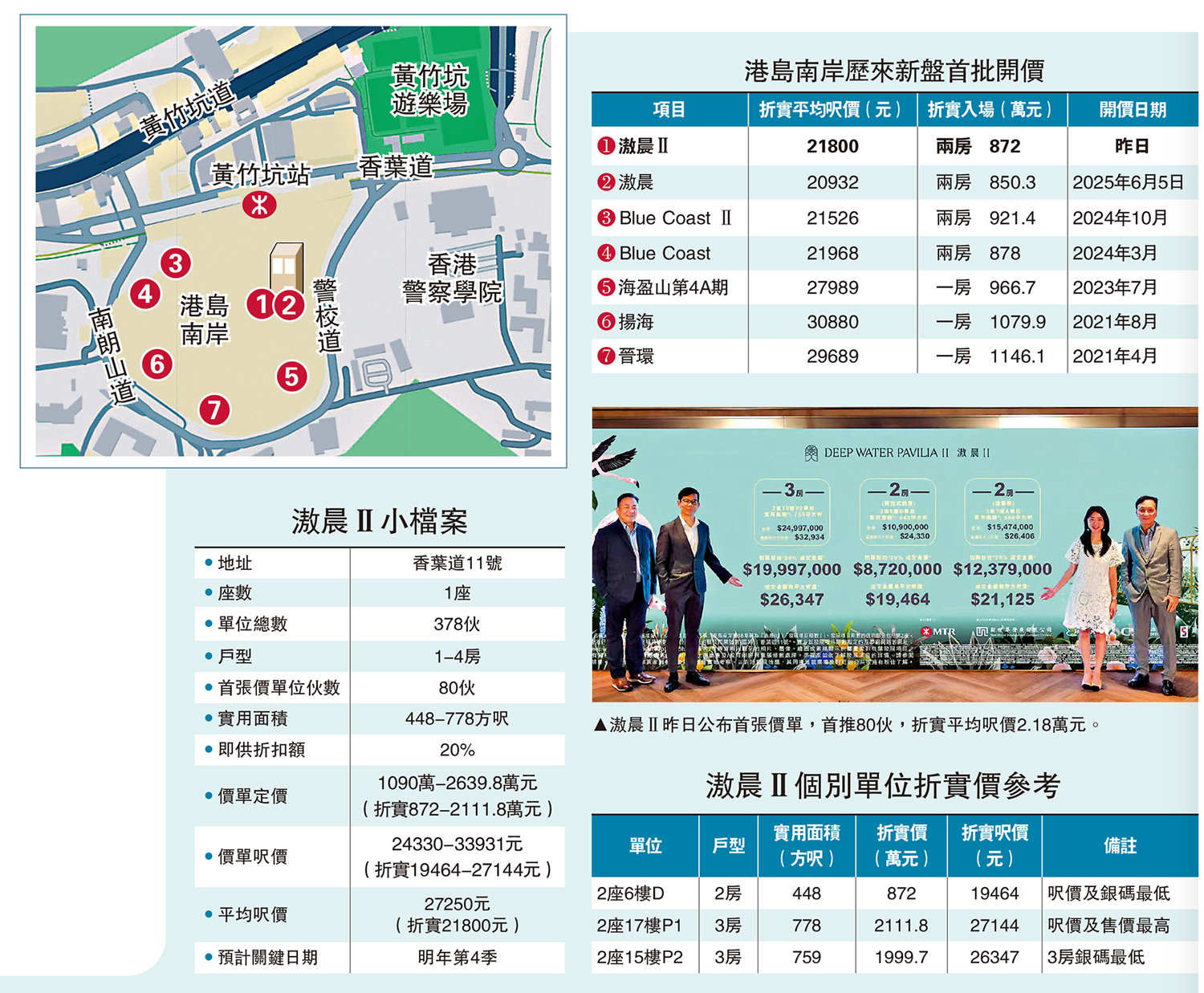 一手交投氣氛升溫,新盤加快推售節奏。新世界(00017)夥資本策略(00497)、麗新(00488)及帝國合資的黃竹坑站滶晨Ⅱ,首推80伙,折實平均呎價2.18萬元,較滶晨首批高4%,折實入場費872萬元,屬港島南岸首批售價及呎價第二低。暫定周末收票最快下周賣。\大公報記者 梁穎賢