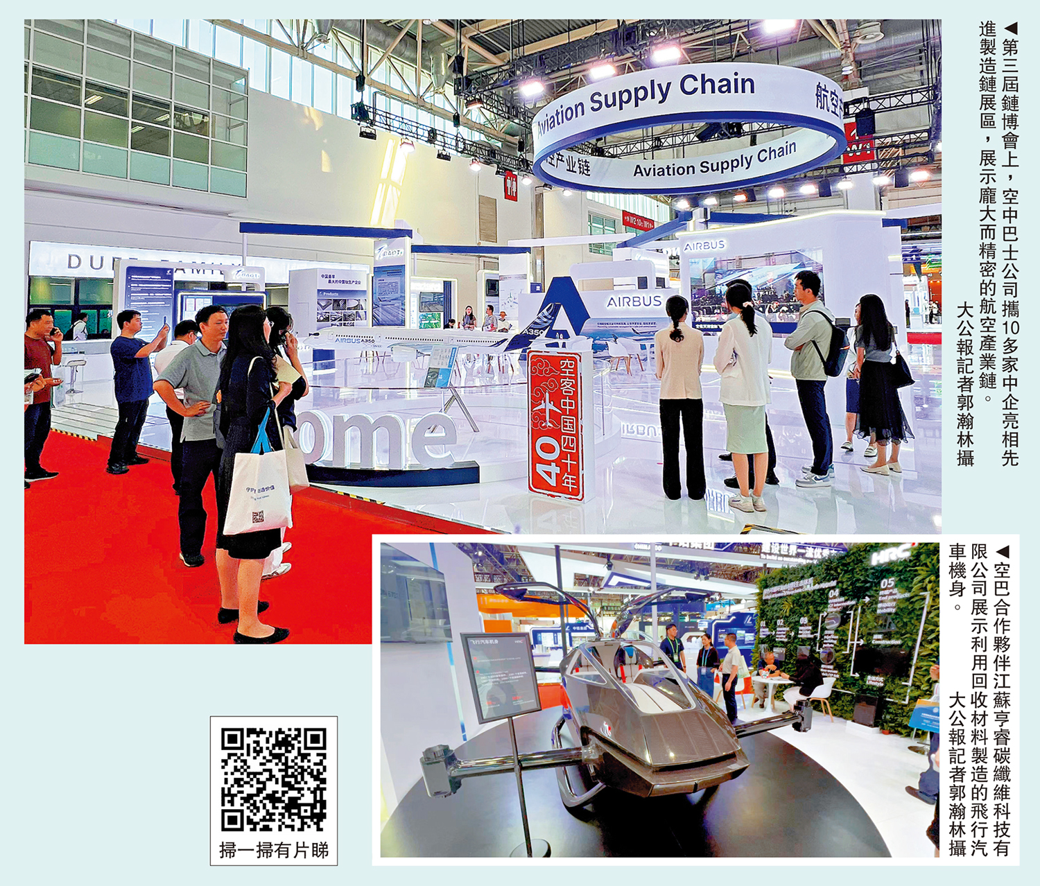 第三屆中國國際供應鏈促進博覽會上,多家中外知名企業聯合上下游合作夥伴直觀呈現了航空航天、智能汽車等領域的最新成果。其中,在先進製造鏈展區新設的航空產業鏈展位,空客(港稱「空中巴士」)公司攜10多家中企亮相先進製造鏈展區,展示龐大而精密的航空產業鏈。智能汽車鏈展區從芯片、電池、配件到整車下線,將生產鏈條上的關鍵技術和產品進行全景呈現。