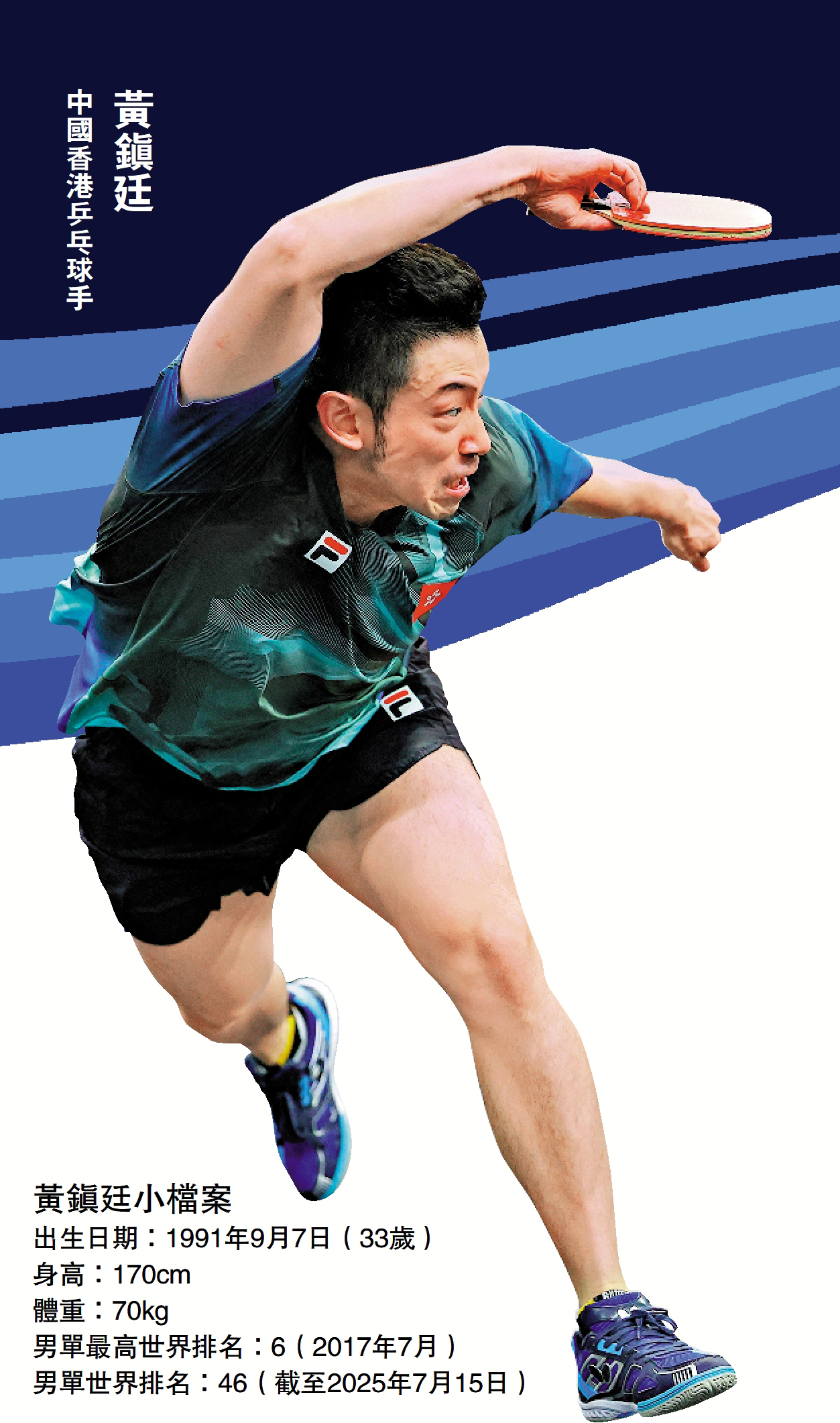 18歲才正式成為職業球員的黃鎮廷,是首位獲得乒乓球三大賽男單獎牌的中國香港選手,曾一度闖進男單世界排名前十。