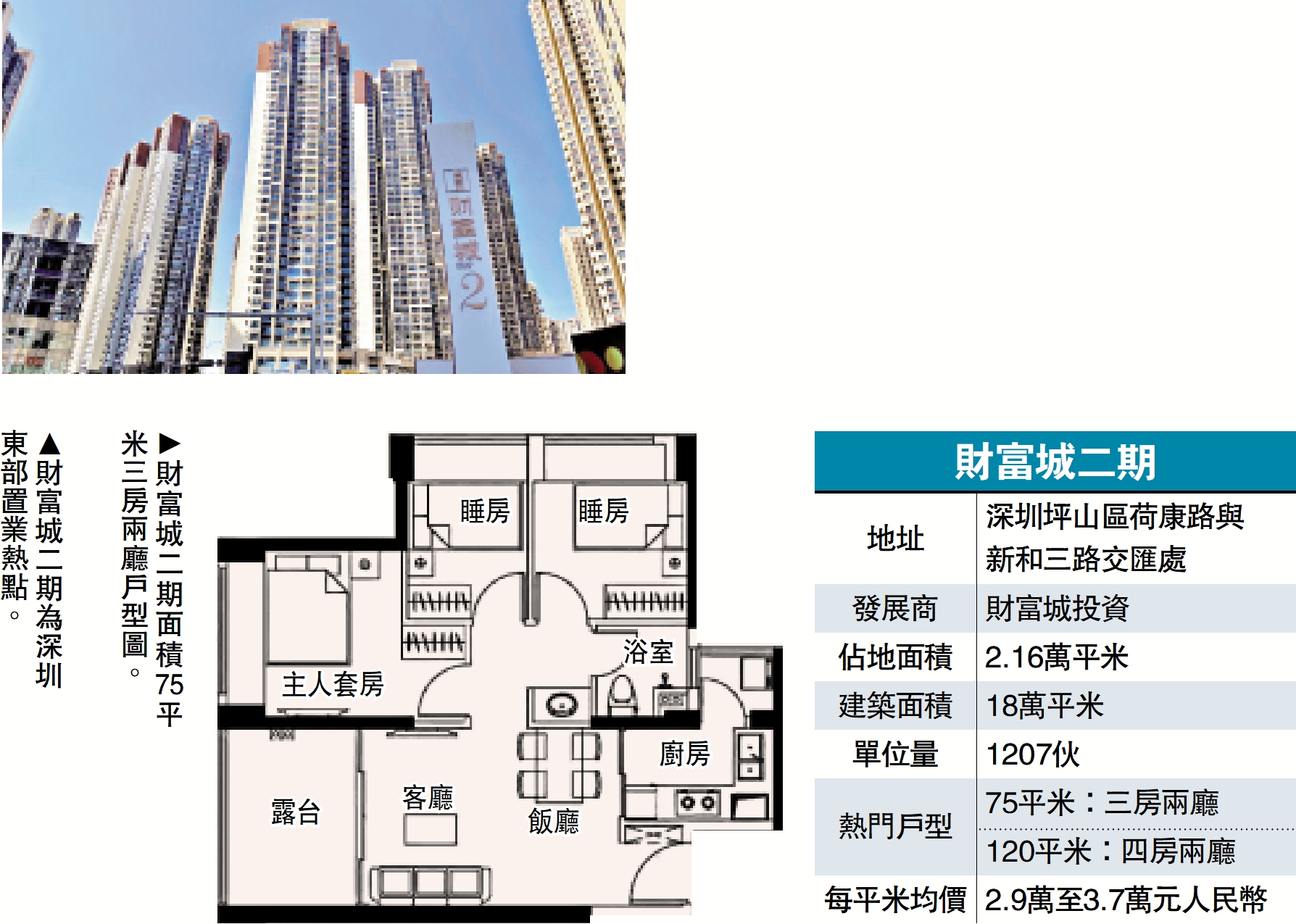 財富城作為坪山中心區140萬平米超大型綜合體,以「中央公園國際住區」為定位,依託半月環公園生態資源與坪山文化六館(圖書館、美術館等)形成「公園+文化」雙IP,成為東部置業熱點。小區一期由10幢38至45層高住宅組成,當前二期75平米三房戶入場費233萬元(人民幣,下同)。