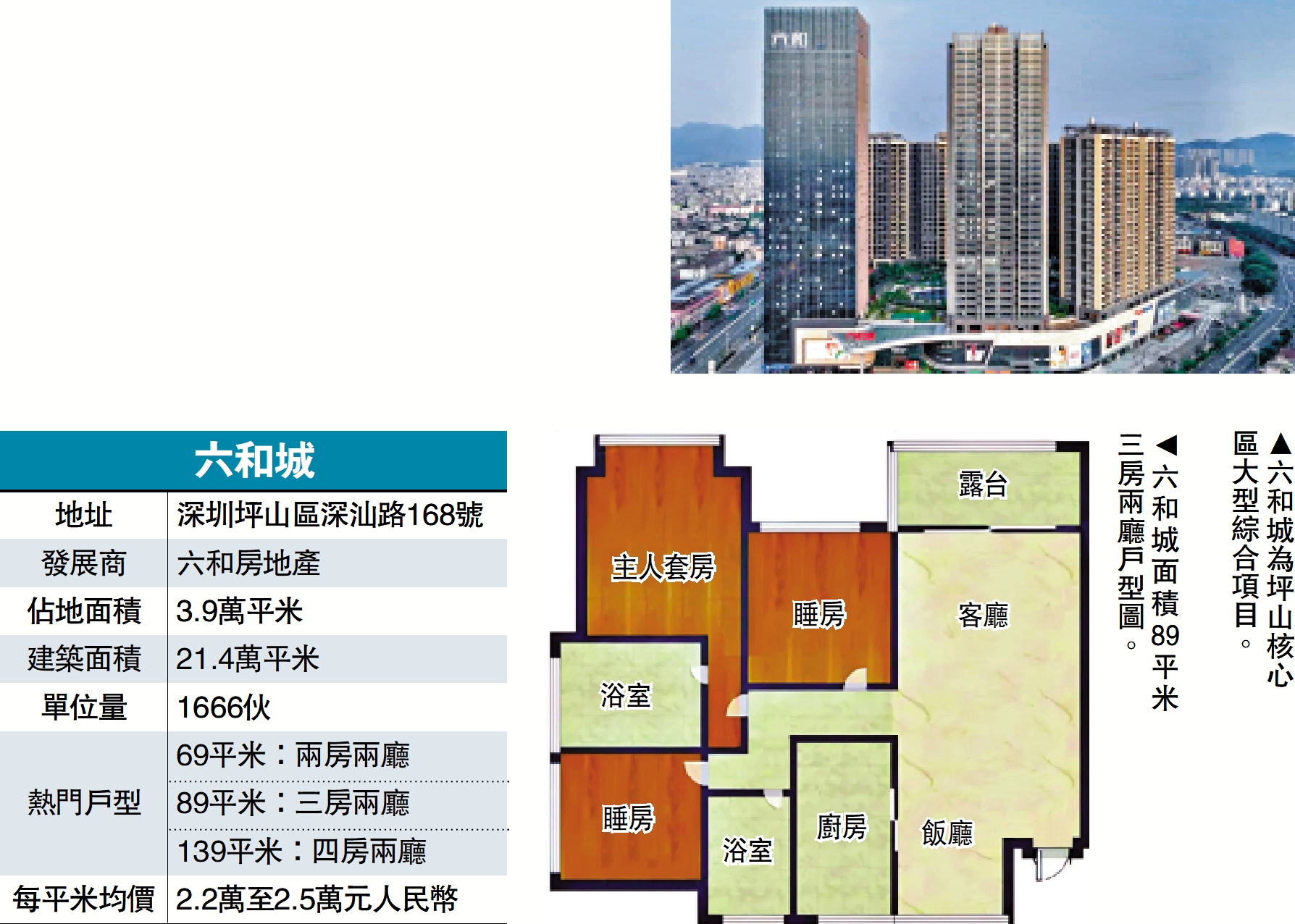 六和城憑藉「雙地鐵+名校+旗艦商業」三重優勢,成為坪山核心區標桿綜合體。項目涵蓋5幢住宅、1幢甲級寫字樓及商場,住宅總數1666伙,每平米均價在2.2萬至2.5萬元(人民幣,下同)。