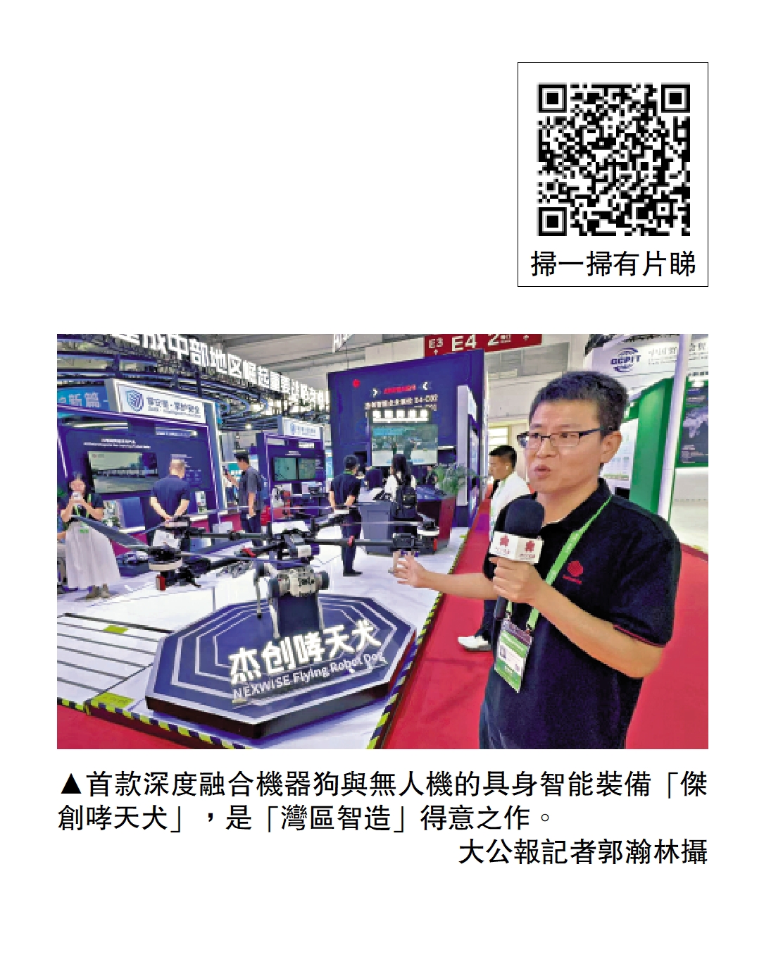 大疆展示了T100農業無人飛機,作為大疆研發的首款搭載AI、AR功能的旗艦級農業無人機,它的容量達150L,支持農藥噴灑、種子播撒等農業場景。展台上更加吸睛的則是一款 「傑創哮天犬」,它是首款深度融合機器狗與無人機的具身智能裝備,集陸地行走和空中飛行於一體,能在複雜的天氣和地形中執行人員搜救、應急物資運輸等任務。\w大公報記者 郭瀚林、任芳頡