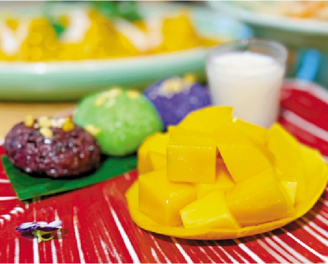 芒果糯米飯堪稱泰國甜點文化的代表作,選用泰國當地盛產的金黃色熟芒果,香甜多汁,切片擺盤,再搭配用椰漿拌煮過的香糯糯米飯,淋上一層濃郁椰醬,最後灑上一點脆米作點綴。一口咬下,是熱糯米的柔韌與椰漿的濃醇交融,再加上冰涼芒果的清甜,三者在口中層層交疊,彷彿熱帶的陽光照耀着舌尖,並綻放出了什麼。