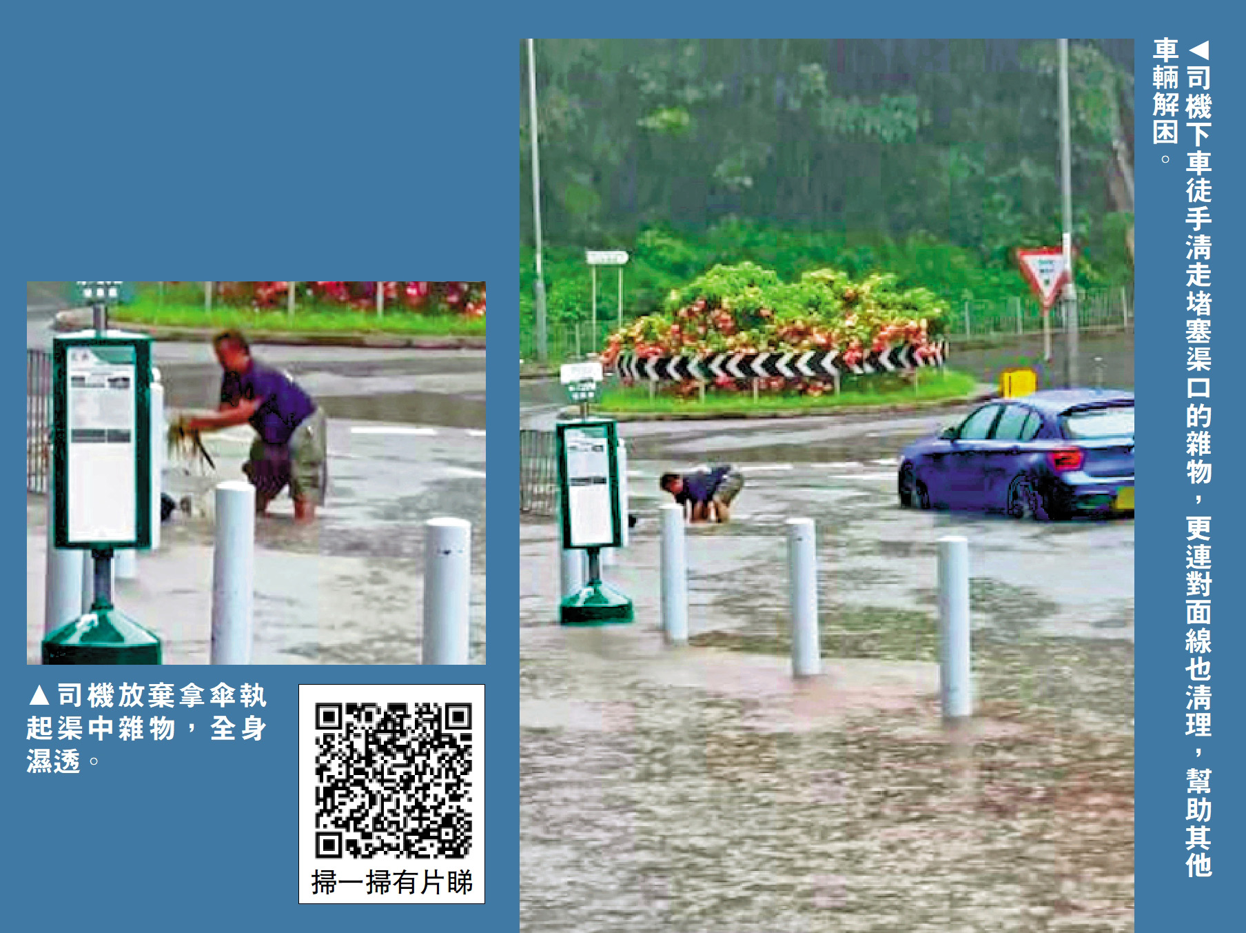 一名網民昨日在社交平台上傳一段視頻,在沙田頭路近秦石邨,風雨交加,路面水浸及膝,車輛無法行駛,其間一名男司機本來右手撐傘下車,沒有用工具,左手徒手嘗試清走堵塞渠口的雜物,未幾收起雨傘,雙手全力執起渠中雜物,幫助疏導積水。「佢落車自己一個徒手摷起坑渠蓋啲堵塞物,佢通完自己嗰邊線之後都冇即刻上車走,仲通埋對面線啲坑渠位先走」。