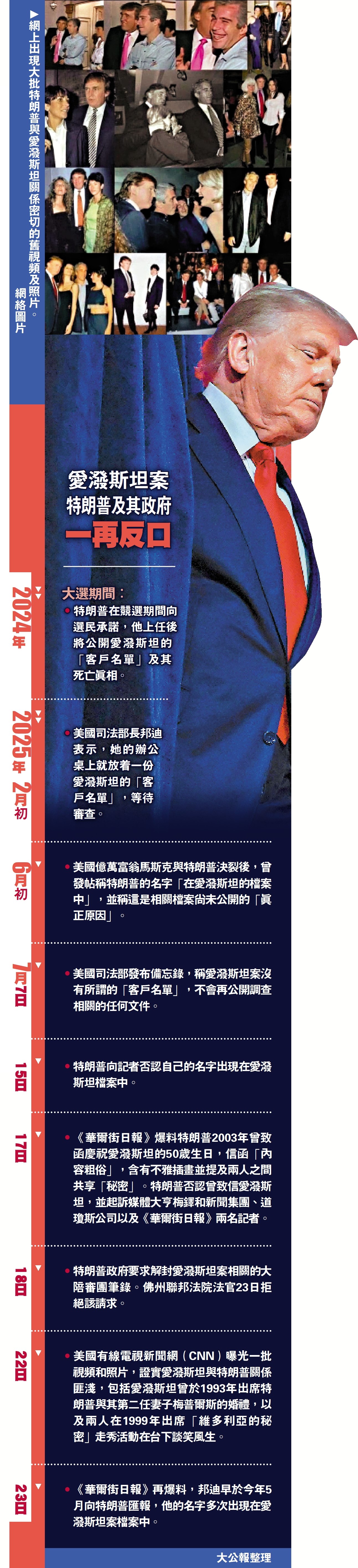 •《華爾街日報》爆料特朗普2003年曾致函慶祝愛潑斯坦的50歲生日,信函「內容粗俗」,含有不雅插畫並提及兩人之間共享「秘密」。特朗普否認曾致信愛潑斯坦,並起訴媒體大亨梅鐸和新聞集團、道瓊斯公司以及《華爾街日報》兩名記者。