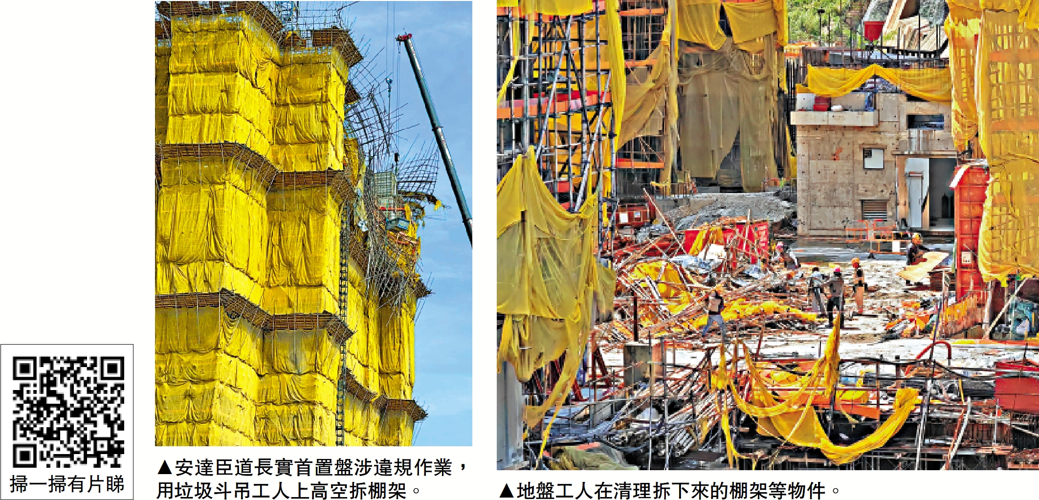 位於觀塘安達臣道的長實「港人首置盤」住宅項目,早前爆出地盤分判商及工程監督人員的貪污醜聞,六幢住宅大廈鋼筋出現偷工減料,10人被廉署拘捕,事件激起公憤。惟地盤復工後再出現違規高空作業,在前日涉嫌違規以吊臂機吊起裝地盤垃圾的貨斗,載着工人「升上20層樓高」,處理因颱風損毀的棚架,有工人在無戴安全頭盔下,伸出半身在高空工作,險象環生。